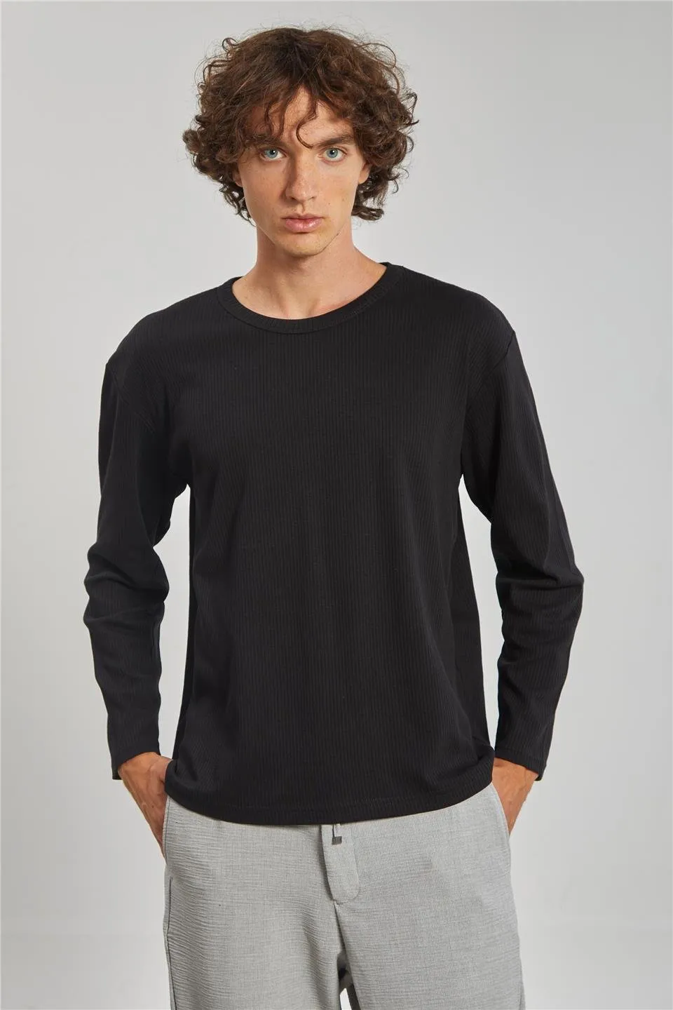 سويت شيرت رجالي كاجوال بأكمام طويلة وسحاب بلون موحد، بياقة مرتفعة وجيوب عملية. مثالي للارتداء فوق الملابس الموسمية والراحة اليومية.