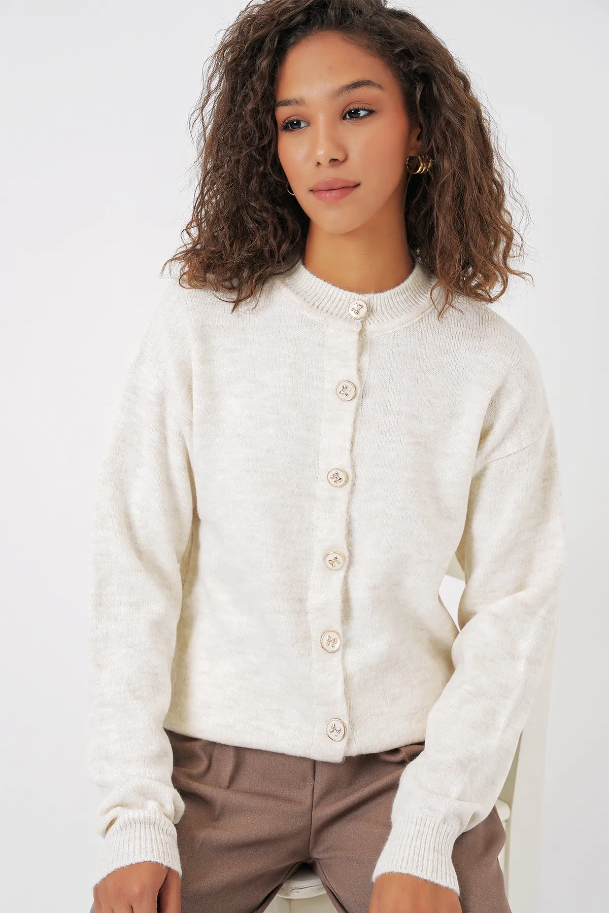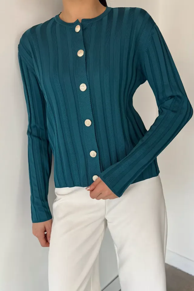 كارديغان تريكو بأكمام قصيرة وياقة دائرية مع لؤلؤ مضلع