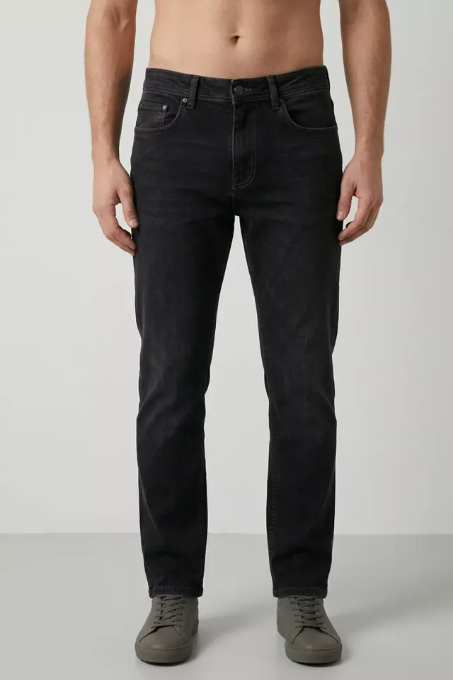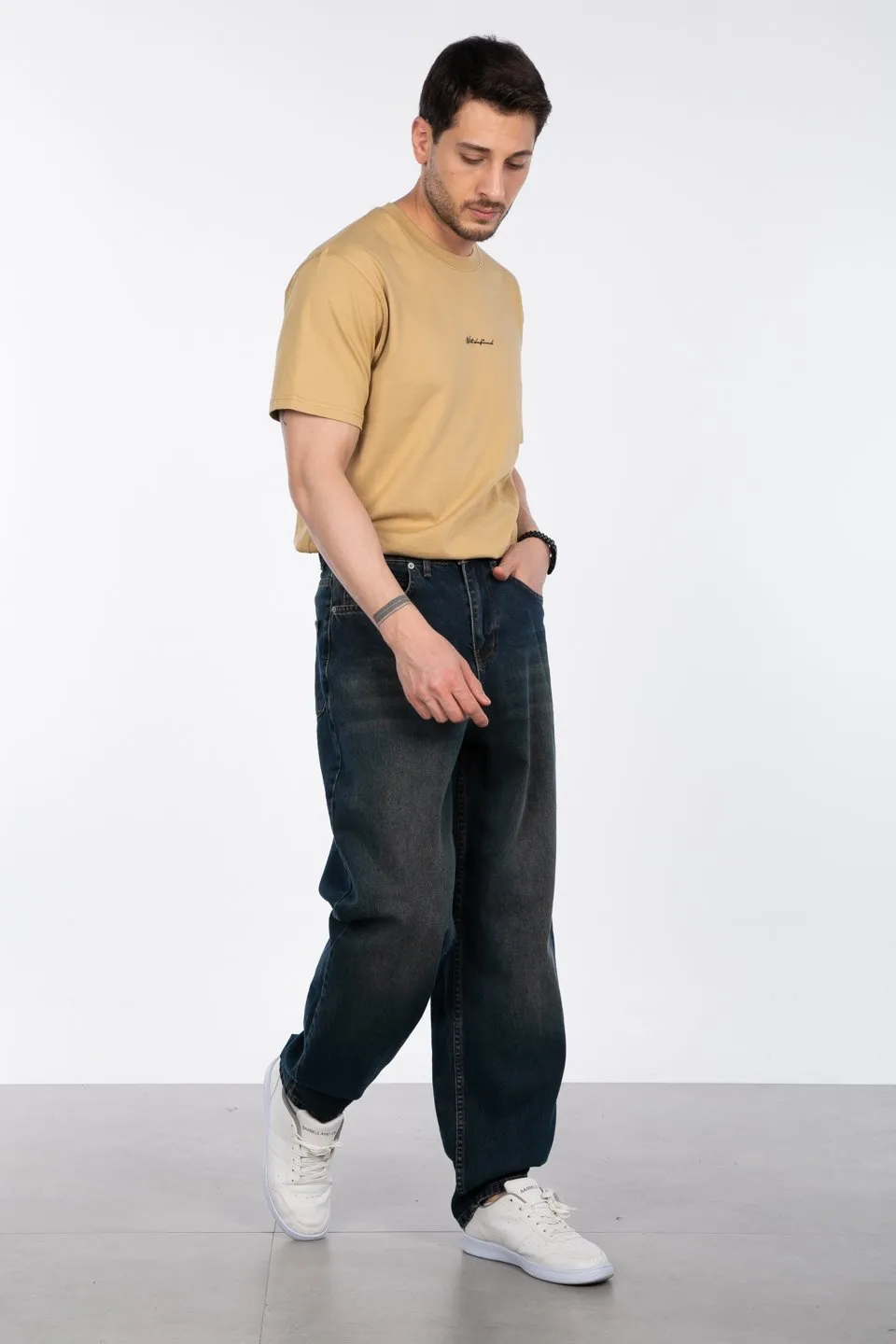 بنطلون جينز رجالي كاجوال واسع الساق بارتفاع عادي وإغلاق بأزرار، مصنوع من القطن بنسبة 100% من أجل الراحة والمتانة والارتداء اليومي الأنيق.