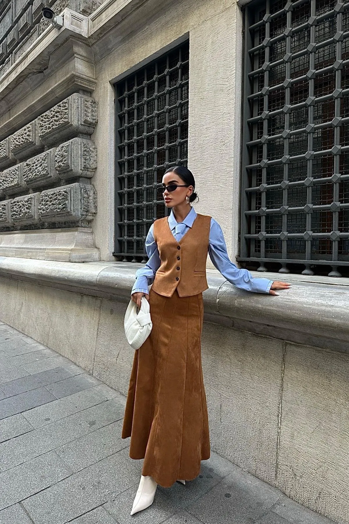 الموديل ترتدي مقاس 38 – الطول 176 سم، الصدر 90 سم، الخصر 63 سم، الورك 94 سم
