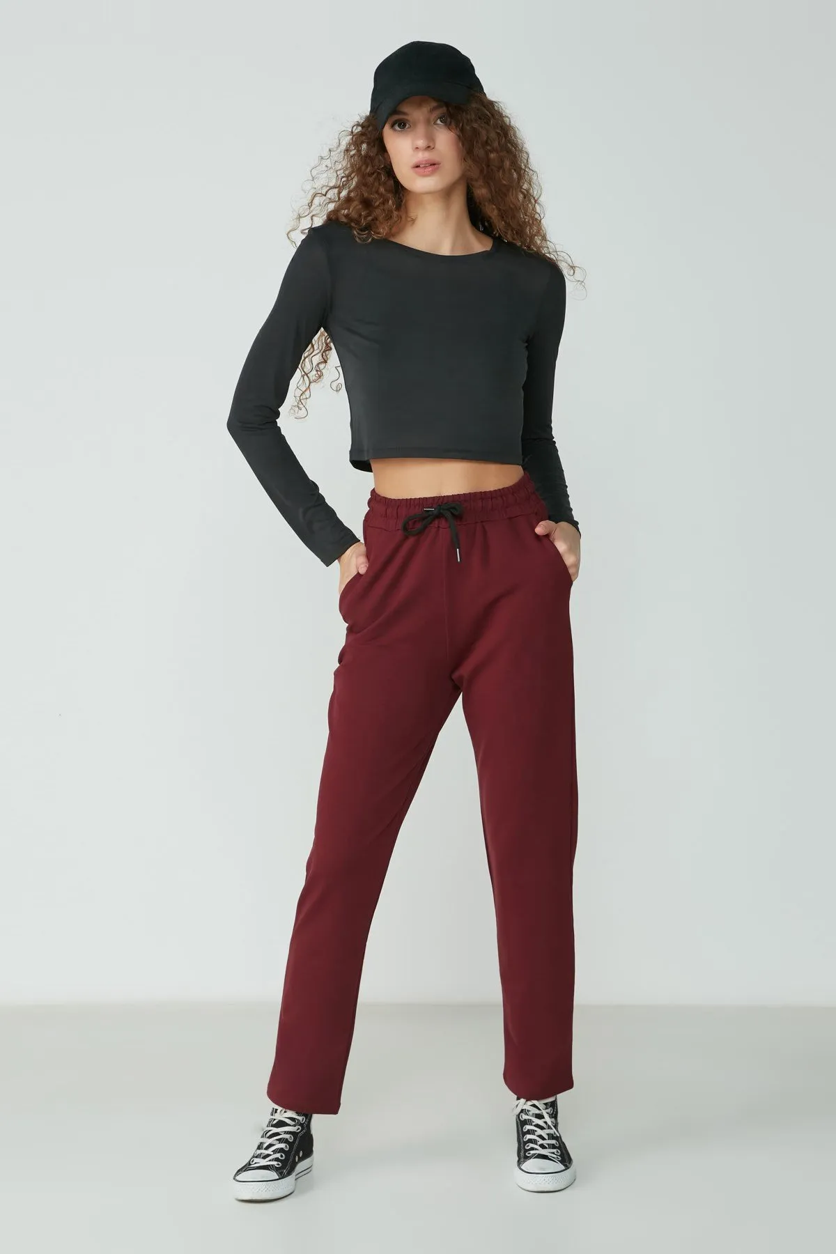 الموديل ترتدي مقاس M – الطول 172 سم، الصدر 83 سم، الخصر 70 سم، الورك 91 سم