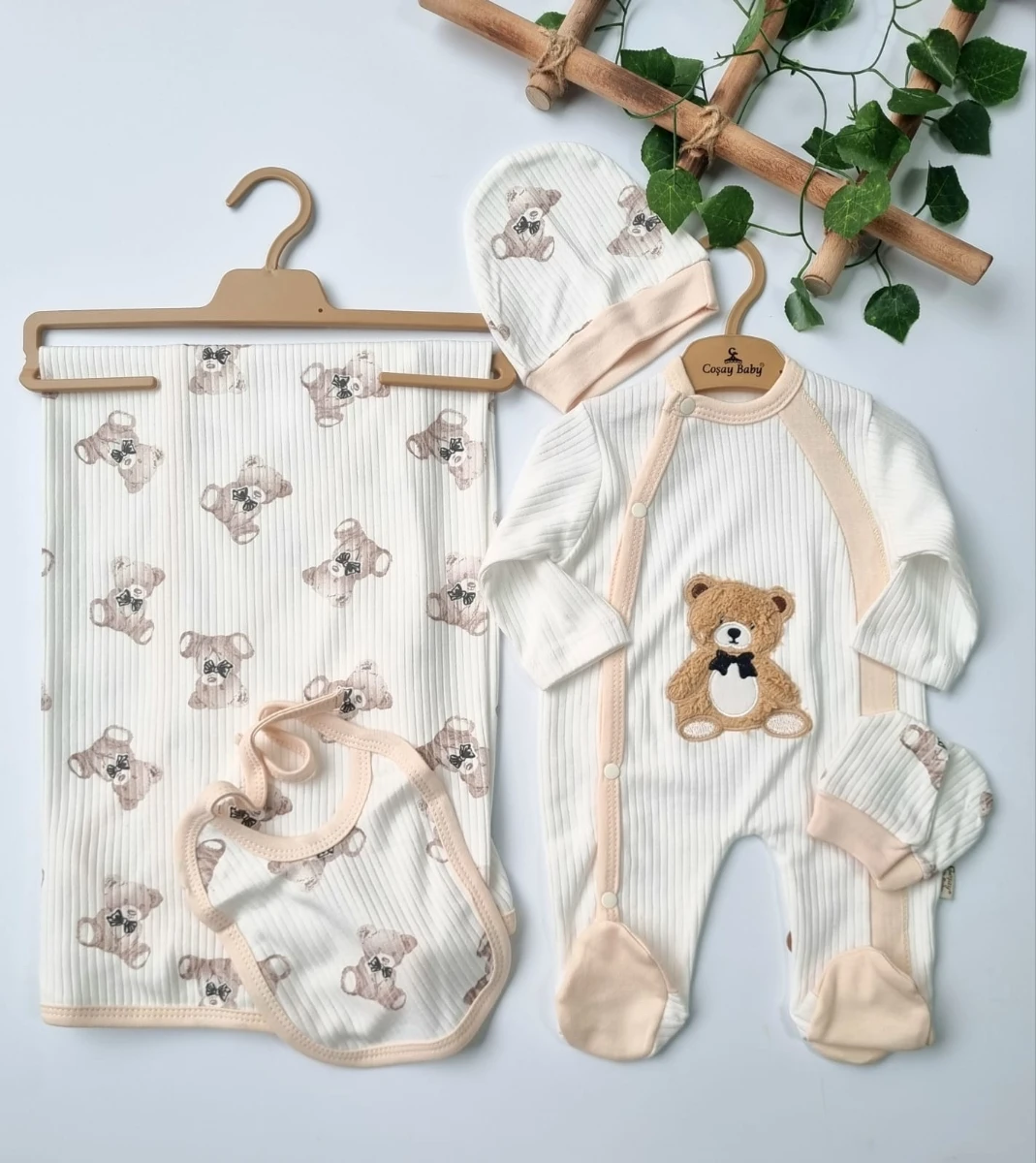 طقم حديثي الولادة المكون من 5 قطع يشمل قطعًا بأكمام طويلة مزينة بطبعة باندا لطيفة، مصمم للراحة وسهولة اللبس.