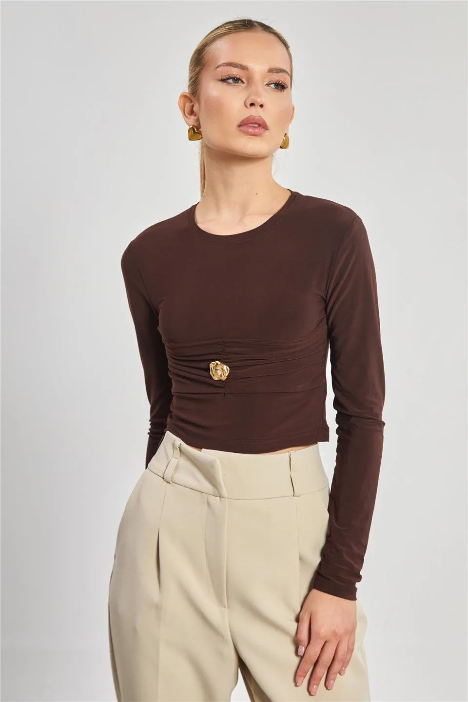 بلوزة نسائية من قماش الدالغيتش بياقة V مع تفاصيل دانتيل على الأطراف وملمس شاردون ناعم لإطلالة أنيقة موسمية.