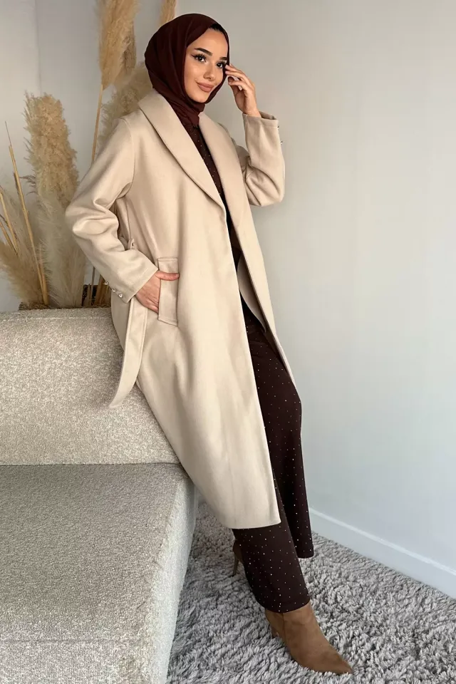 معطف نسائي من الصوف بياقة مرتفعة وأكمام واسعة مع حزام خصر