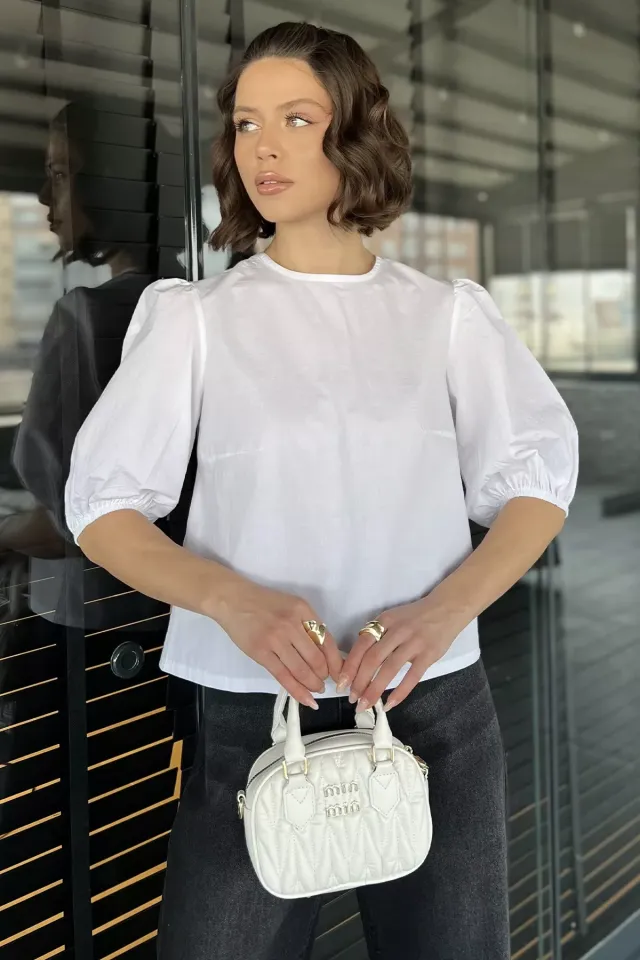 بلوزة مريحة من قماش موسلين بخصر مجمع وأكمام بالون مطاطية مصنوعة من قطن 100٪ لإطلالة صيفية خفيفة.