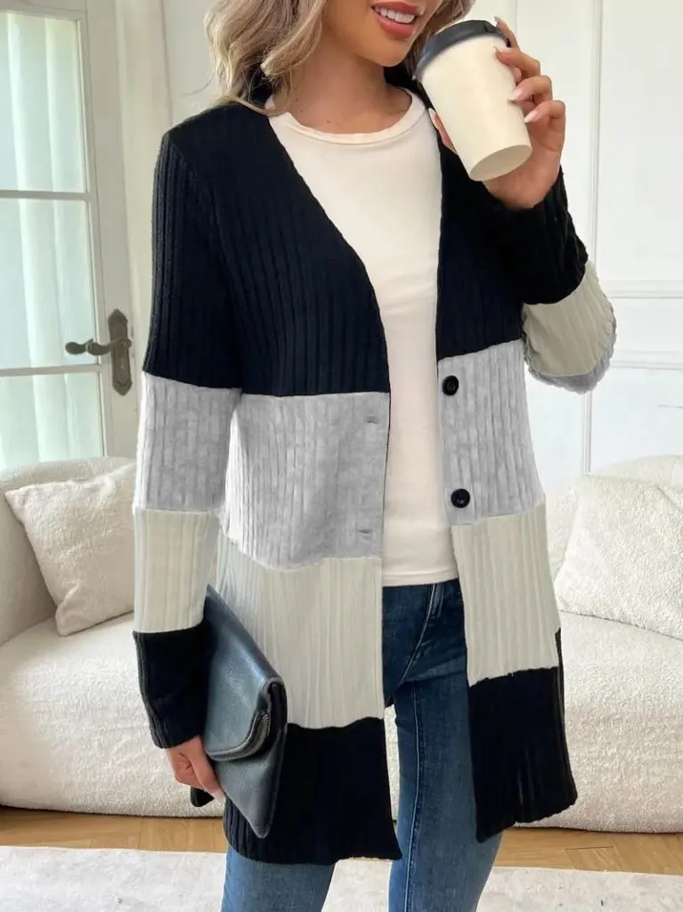 كارديغان تريكو أنيق بياقة V وتفصيل رباط أمامي لإطلالات يومية أنيقة بمواسم الانتقال. ٪100 قماش تريكو (نسيج ناعم). غير مبطن بتصميم مريح يسمح بالتهوية.