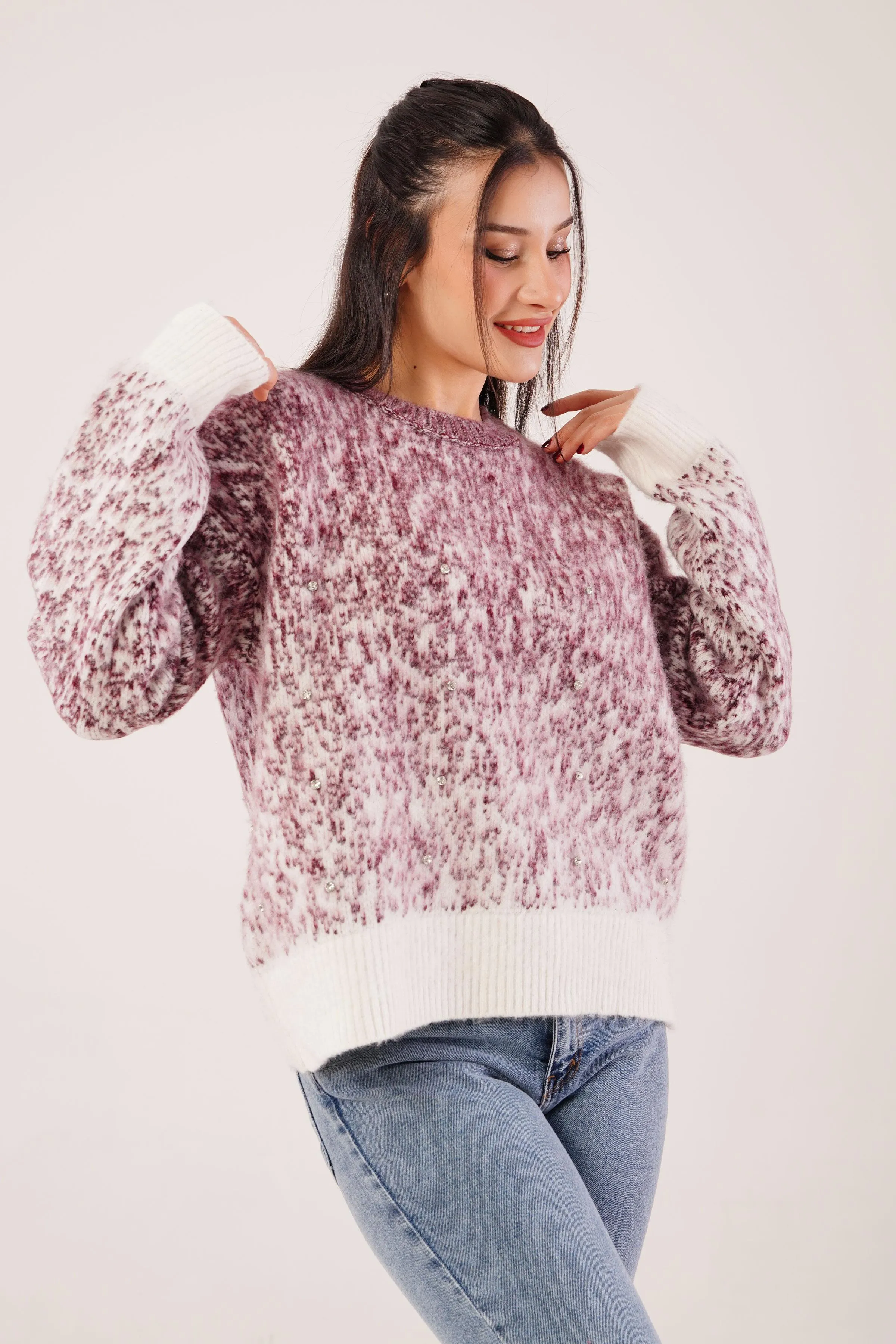 كنزة تريكو أوفر سايز دافئة بياقة دائرية وأكمام طويلة لإطلالات شتوية يومية مريحة. ٪80 أكريليك، ٪20 بوليستر (قماش تريكو). غير مبطنة بتصميم ناعم الملمس. الطول 57 سم. الموديل ترتدي مقاس S – الطول 178 سم، الصدر 90 سم، الخصر 64 سم، الورك 94 سم.