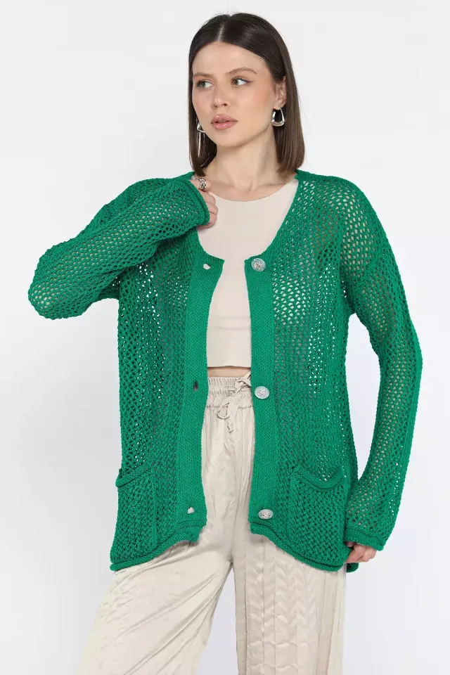 كارديغان تريكو أنيق بإغلاق كبس وتفصيل ورد مطرز لإطلالات شتوية دافئة وأنيقة. ٪75 أكريليك، ٪22 بوليستر، ٪3 إيلاستان (خيوط ناعمة مشبّكة). غير مبطن بتصميم سهل العناية. الطول 53 سم. الموديل ترتدي مقاس S – الطول 178 سم، الصدر 90 سم، الخصر 64 سم، الورك 94 سم.