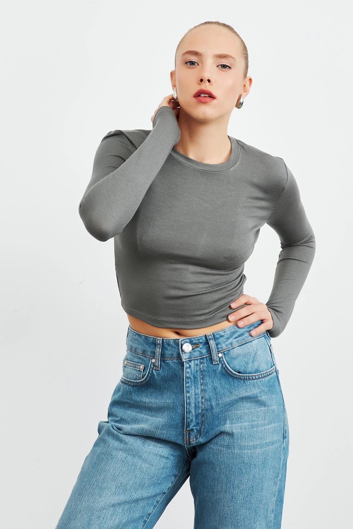 بلوزة قصيرة بأكمام قصيرة وتفاصيل حواف من قماش مرن تمنحك لوك صيفي عصري.