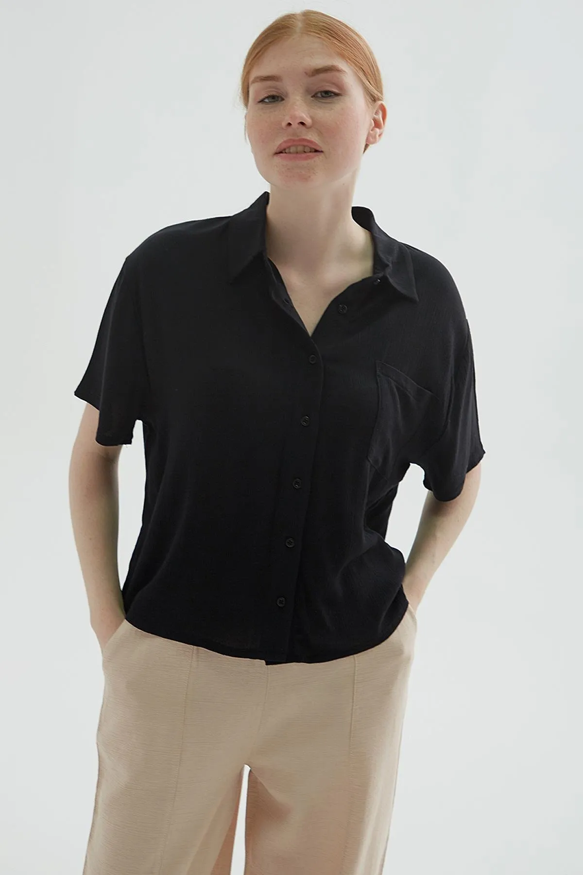 قميص قصير بقماش يشبه الكتان بحافة سفلية منحنية وأكمام قصيرة بتصميم مريح يمنحك إحساسًا خفيفًا ومنعشًا في الصيف.