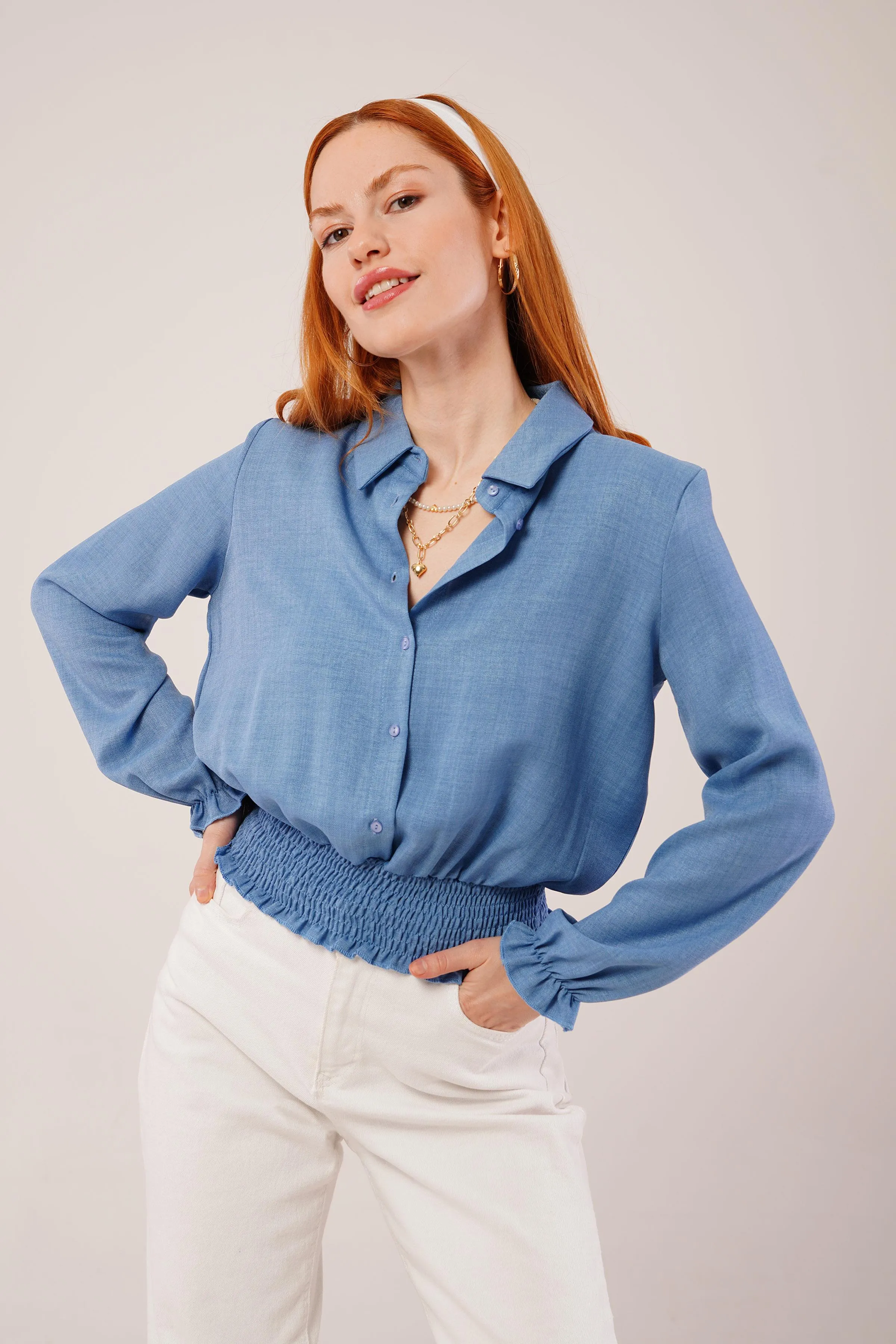بلوزة كروب من قماش الموسلين بربطة أمامية وأكمام كلوش تمنحك لوك صيفي مريح وأنيق.