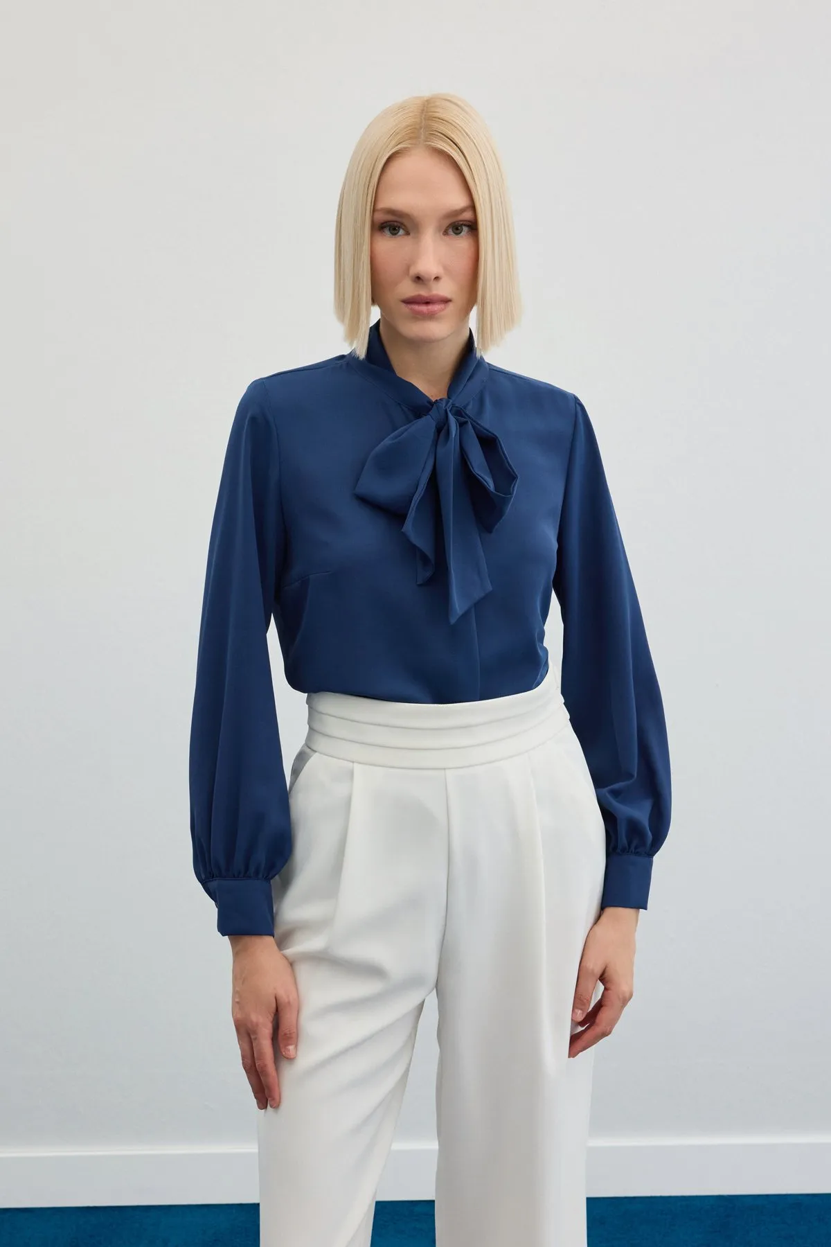 قميص بسطح ساتان ناعم بقصة منسدلة وحافة منحنية بتصميم بأكمام طويلة ولمسة ناعمة لإطلالة يومية أنيقة.