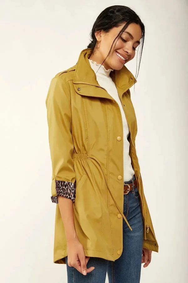 ترنش كوت نسائي طويل بقبعة وحزام خصر قابل للضبط وبطانة مخططة بتصميم عصري مريح.