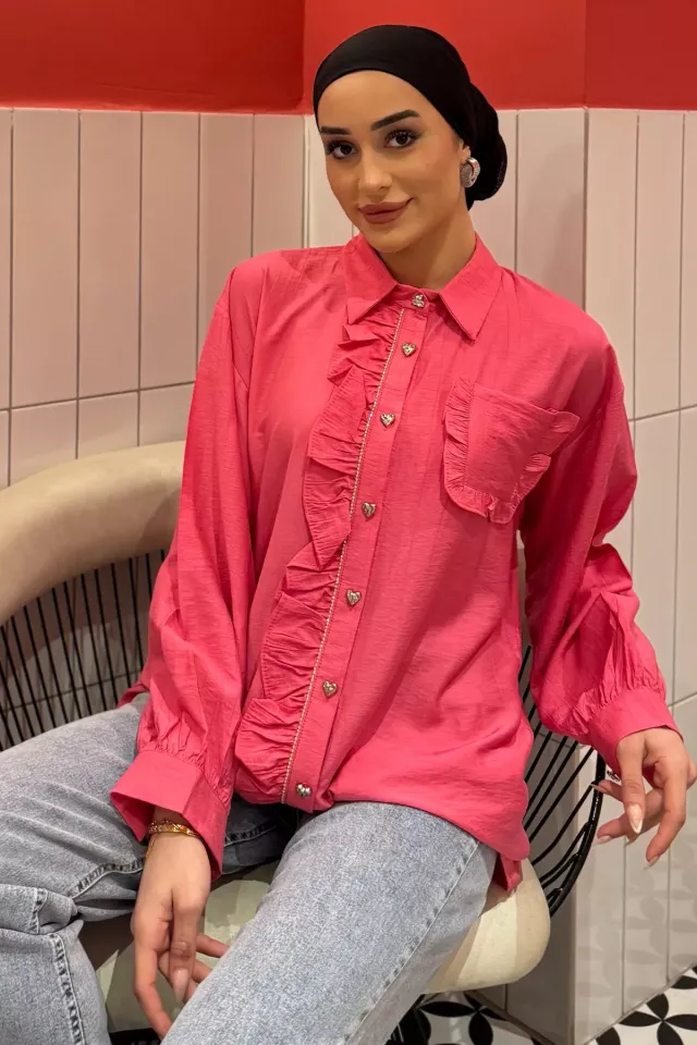 قميص نسائي محتشم بسطح ساتان لامع وحافة منحنية، يتميز بقماش ناعم وسقوط خفيف يمنح مظهرًا أنيقًا ومريحًا. مصنوع من بوليستر 100% بقصّة منتظمة تحتضن القوام بلطف دون ضيق، ليمنحك أناقة عصرية مريحة طوال اليوم.