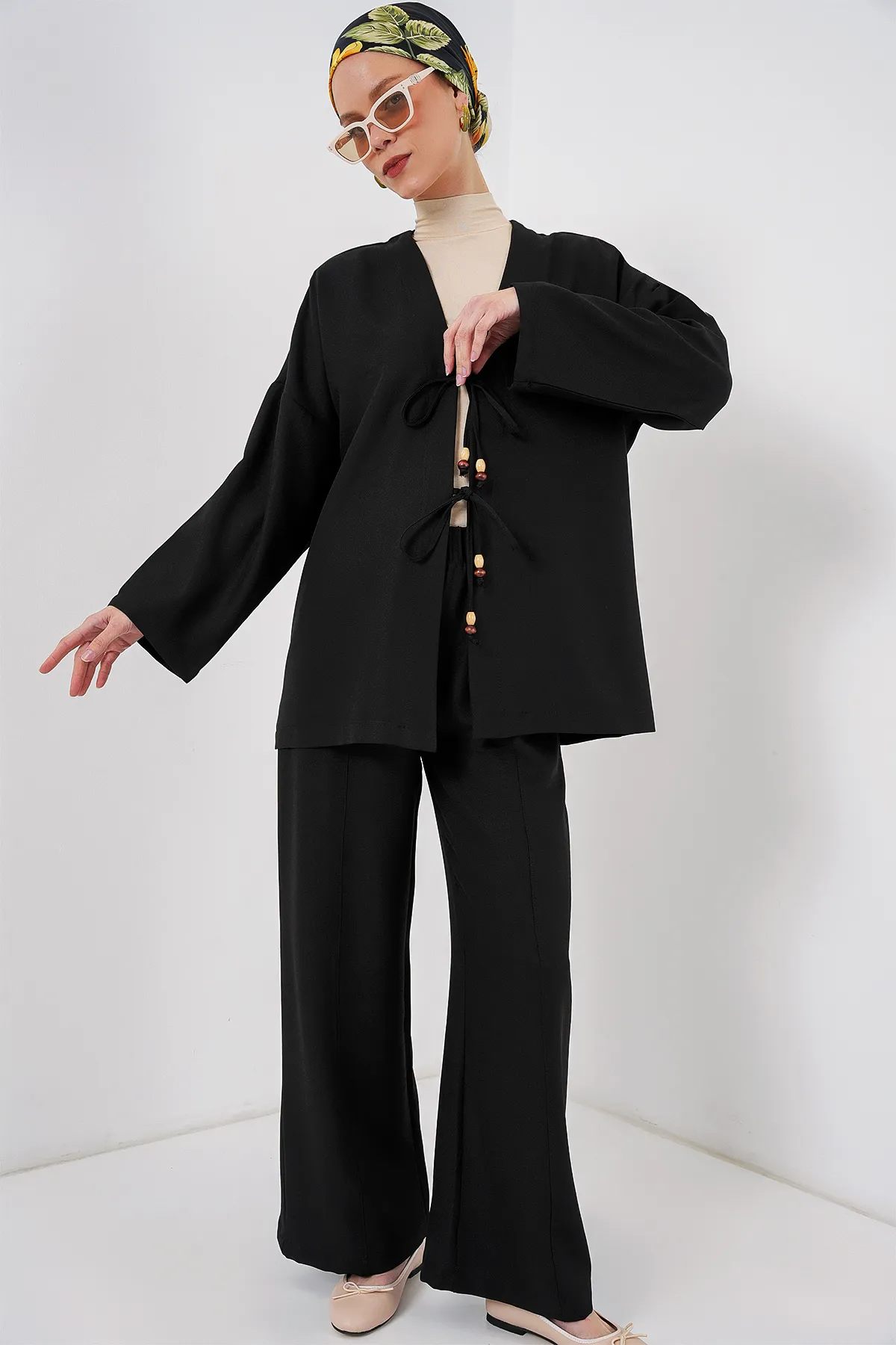 طقم نسائي محتشم مصنوع من قماش محبوك ناعم بقصّة واسعة تمنحك راحة وأناقة في آن واحد. مصنوع من مزيج متين من 97٪ بوليستر و3٪ أكريليك، بقصّة فضفاضة توفر حرية الحركة وتصميم بسيط يعكس أناقة محتشمة مثالية للإطلالات اليومية.