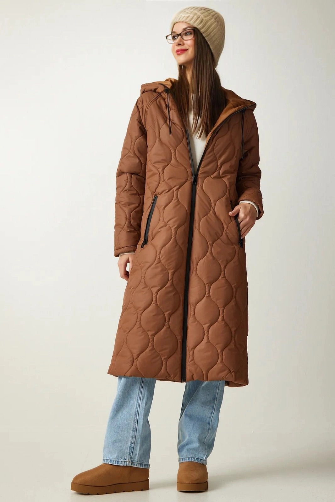 كابان شتوي طويل مبطن بتصميم كابيتوني بغطاء رأس وسحّاب أمامي لإطلالة شتوية دافئة وعصرية.