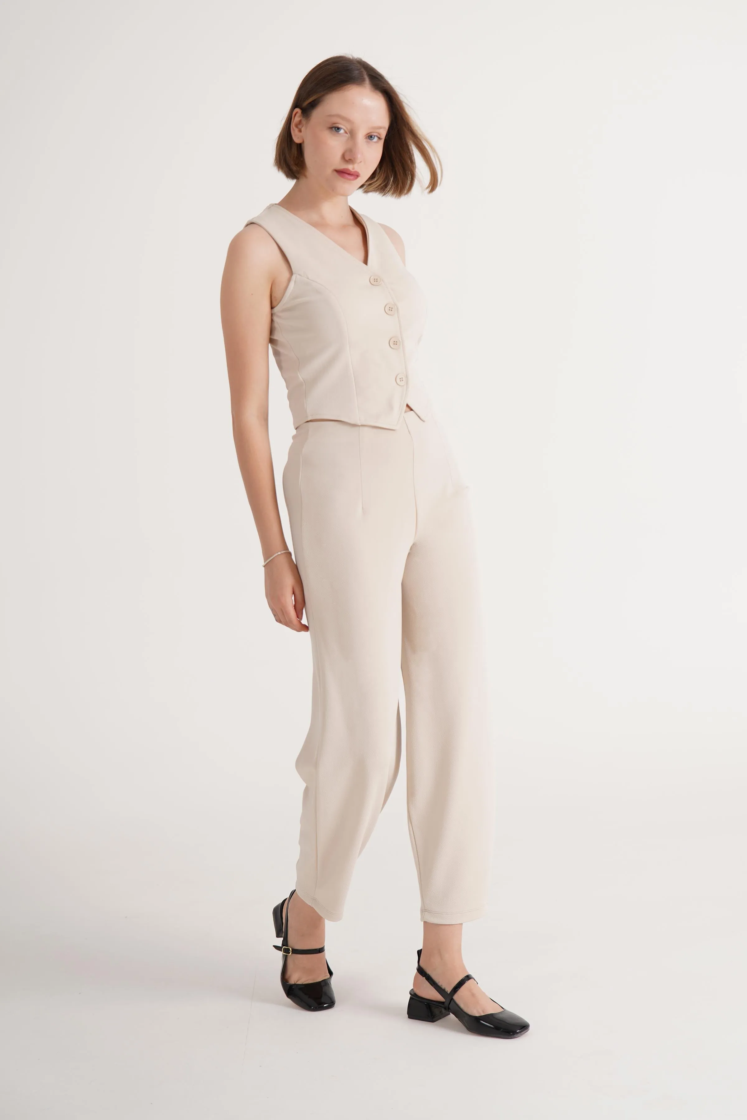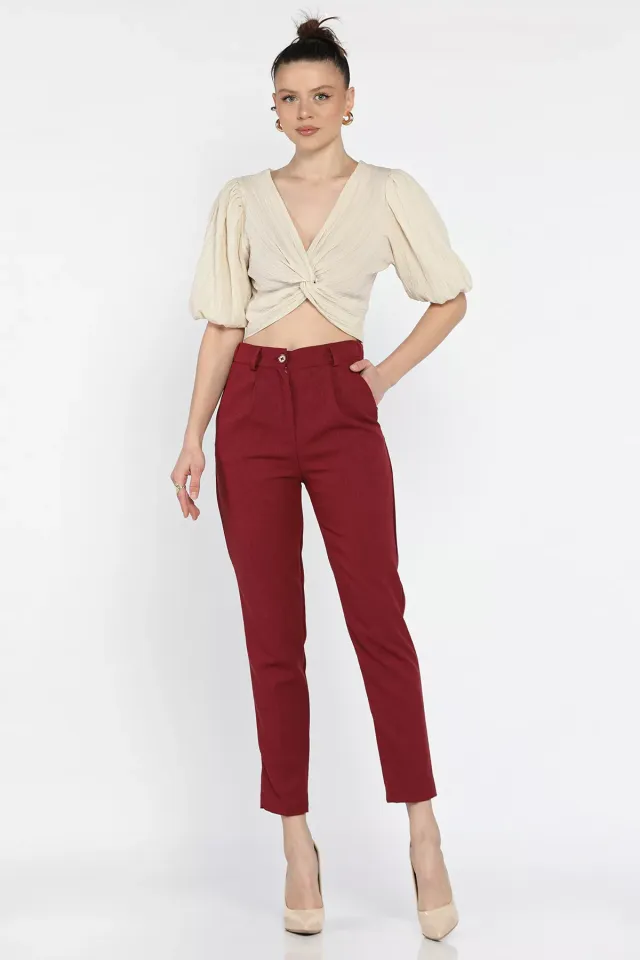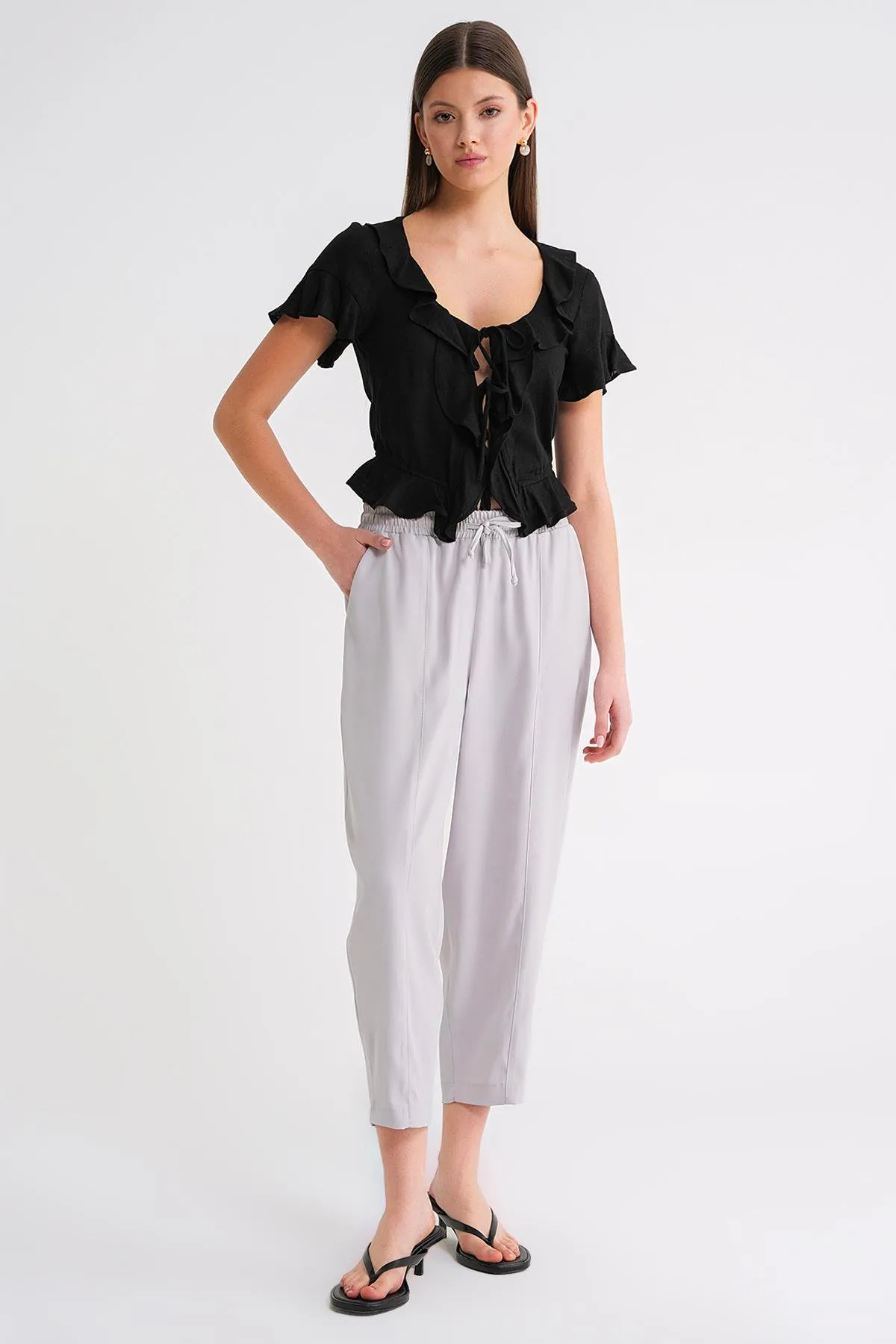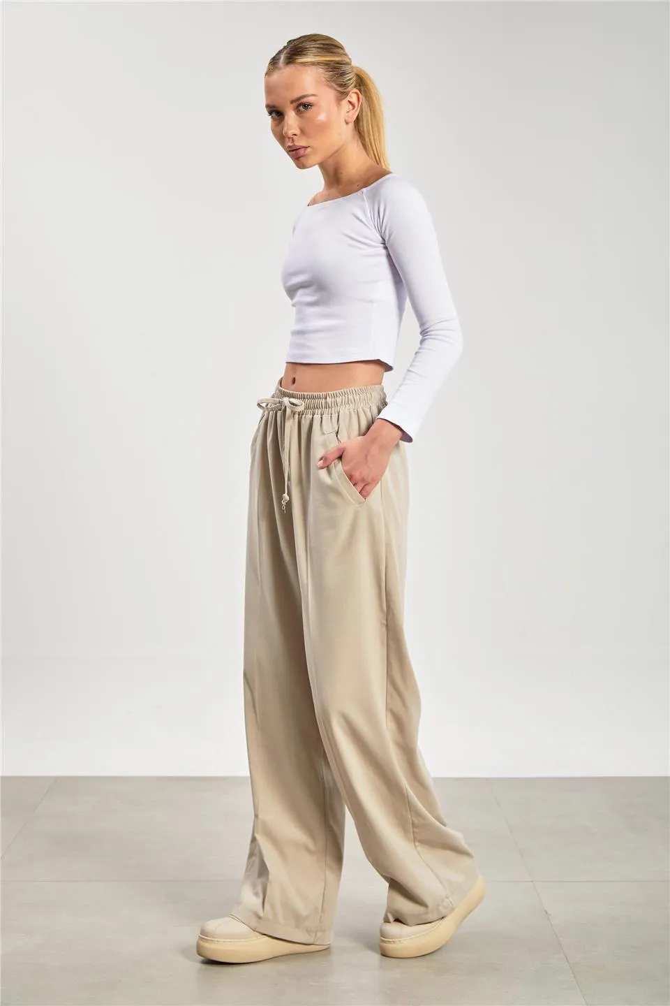 بنطال كتان مستورد بخصر عالي مطاطي وتفصيل شق في الحافة بتصميم مريح وخفيف لاطلالة صيفية منعشة.