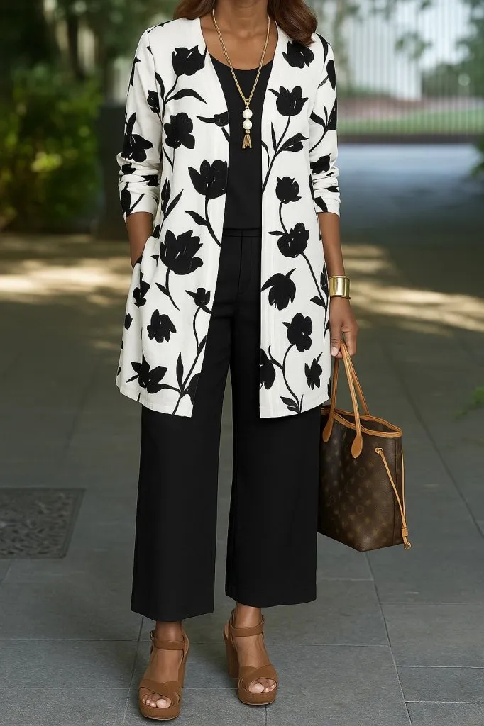 طقم نسائي مكوّن من قميص بأكمام طويلة من قماش كتان ممزوج مع بنطال واسع الساق بتصميم فضفاض بدون جيوب أو بطانة. مصنوع من ٪70 بوليستر و٪30 كتان. طول القميص 76 سم وطول البنطال 116 سم. الموديل ترتدي مقاس M/38 – الطول 176 سم، الصدر 90 سم، الخصر 63 سم، الورك 94 سم.