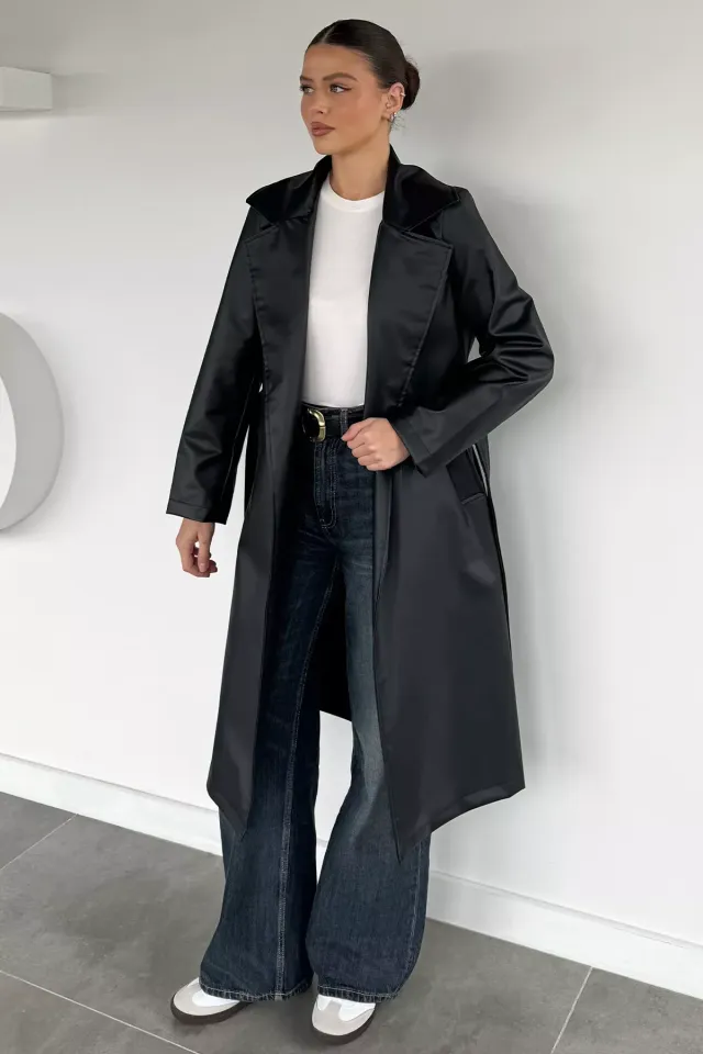 ترنش كوت نسائي طويل بحزام خصر وتفاصيل جيوب