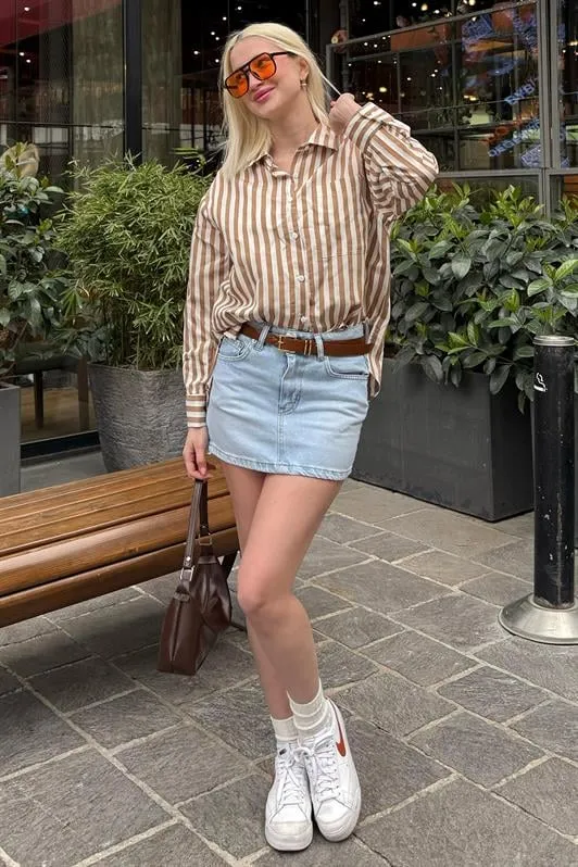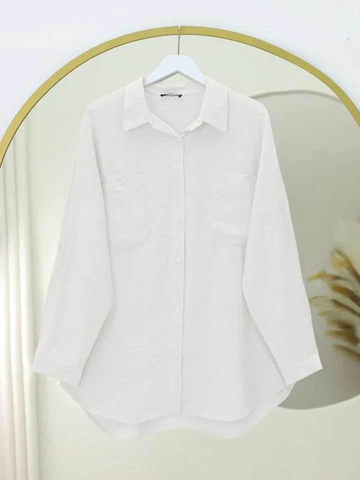 قميص بسطح ساتان ناعم بقصة منسدلة وحافة منحنية بتصميم بأكمام طويلة ولمسة ناعمة لإطلالة يومية أنيقة.