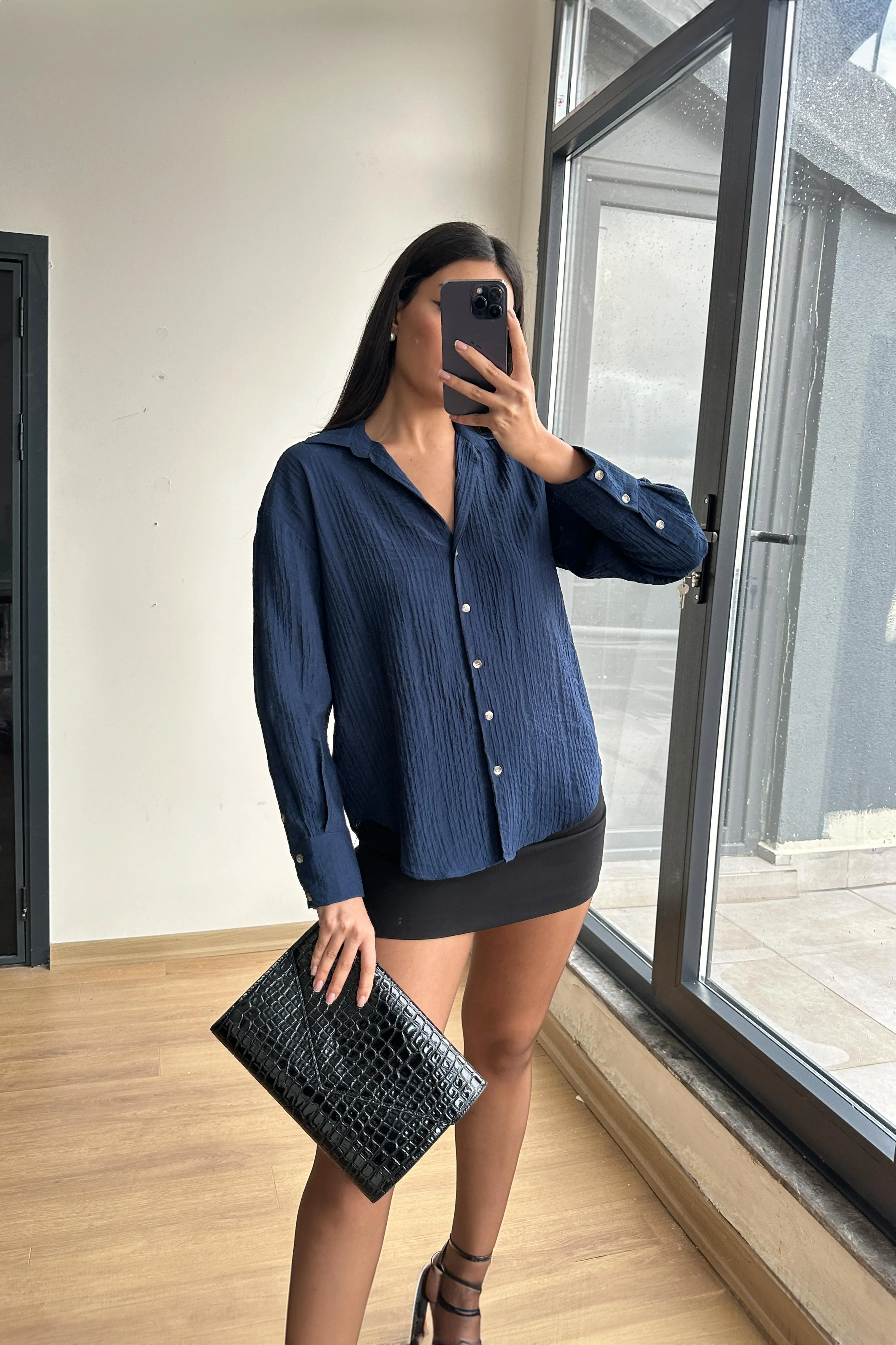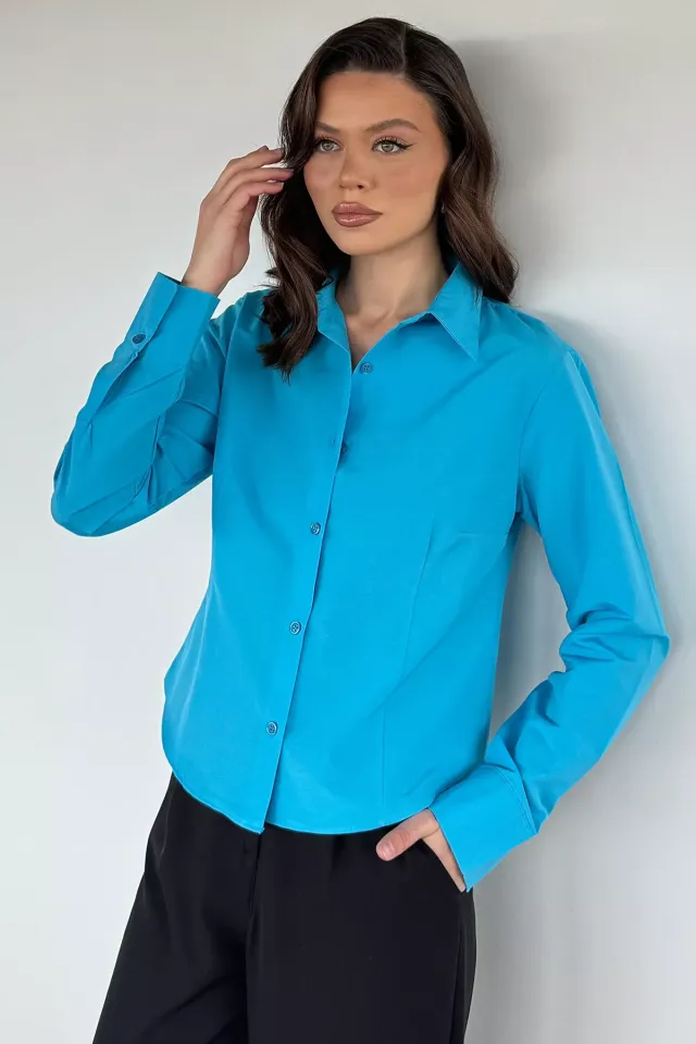 قميص بسطح ساتان ناعم بقصة منسدلة وحافة منحنية بتصميم بأكمام طويلة ولمسة ناعمة لإطلالة يومية أنيقة.