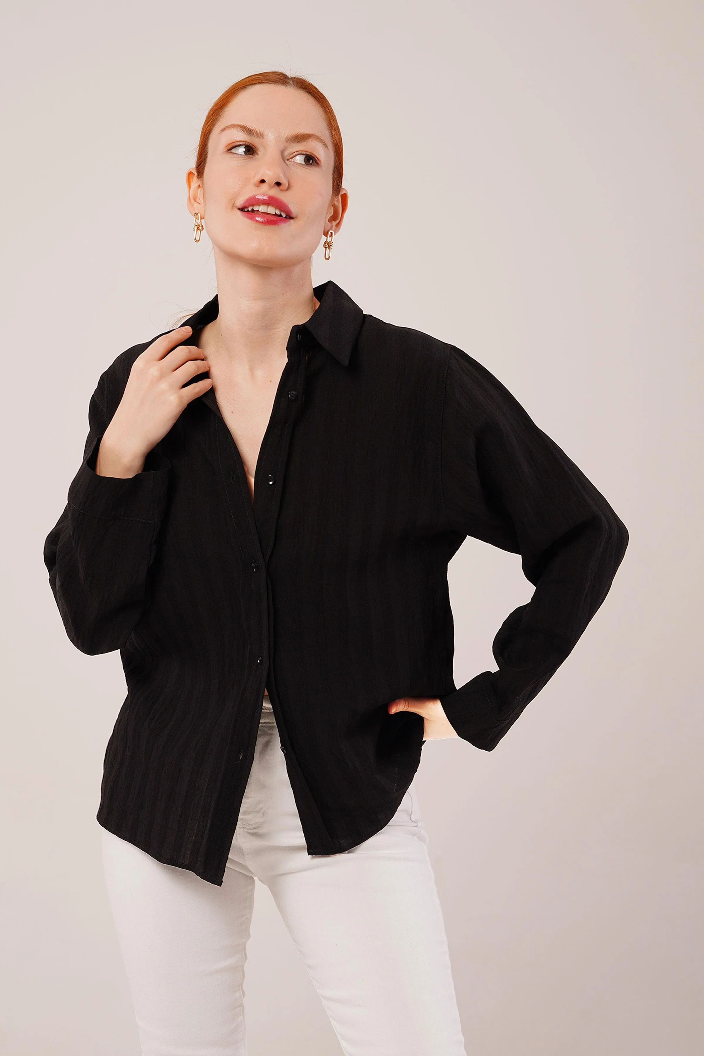 قميص طويل أوفر سايز بحافة سفلية منحنية وقصة مريحة مصنوع من مزيج قطن ناعم يمنحك أناقة يومية سهلة.