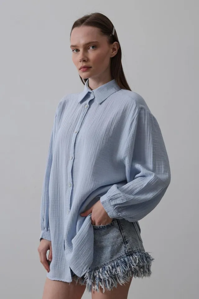 قميص طويل أوفر سايز بحافة سفلية منحنية وقصة مريحة مصنوع من مزيج قطن ناعم يمنحك أناقة يومية سهلة.
