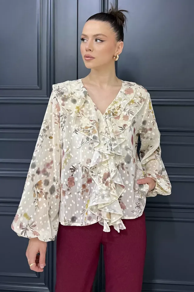 بلوزة فيسكوز مطبوعة بياقة دائرية وأكمام طويلة للنساء - Beyond Store