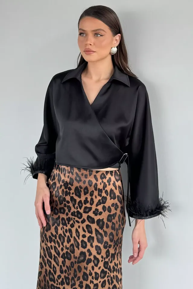 بلوزة نسائية من الكريب بياقة عالية وأكتاف منفوخة وتفصيل ربطة خلفية تمنحك لوك أنيق وعصري.