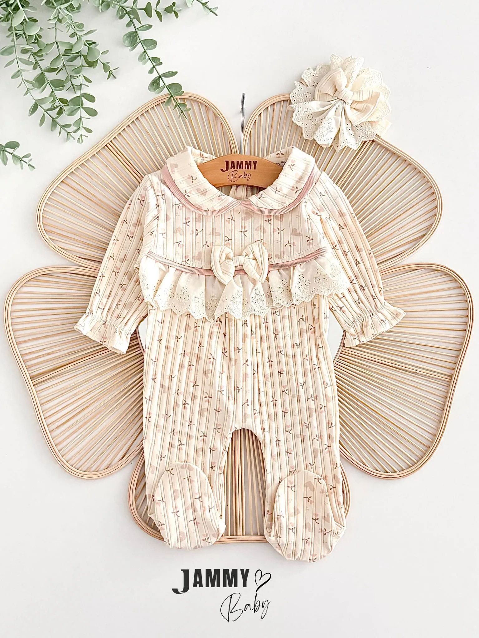 رومبر قطني للبنات الرضع بتفصيل فيونكة لامعة، مصنوع من قماش قطني ناعم 100٪ يمنح تهوية وراحة مثالية طوال اليوم. لطيف على بشرة الطفلة الحساسة ويجمع بين اللمسة البراقة والنعومة لإطلالات صيفية كيوت ومريحة. قصة قياسية ينصح باختيار نفس مقاس الطفلة المعتاد. يغسل في الغسالة على درجة حرارة منخفضة وبرنامج لطيف.