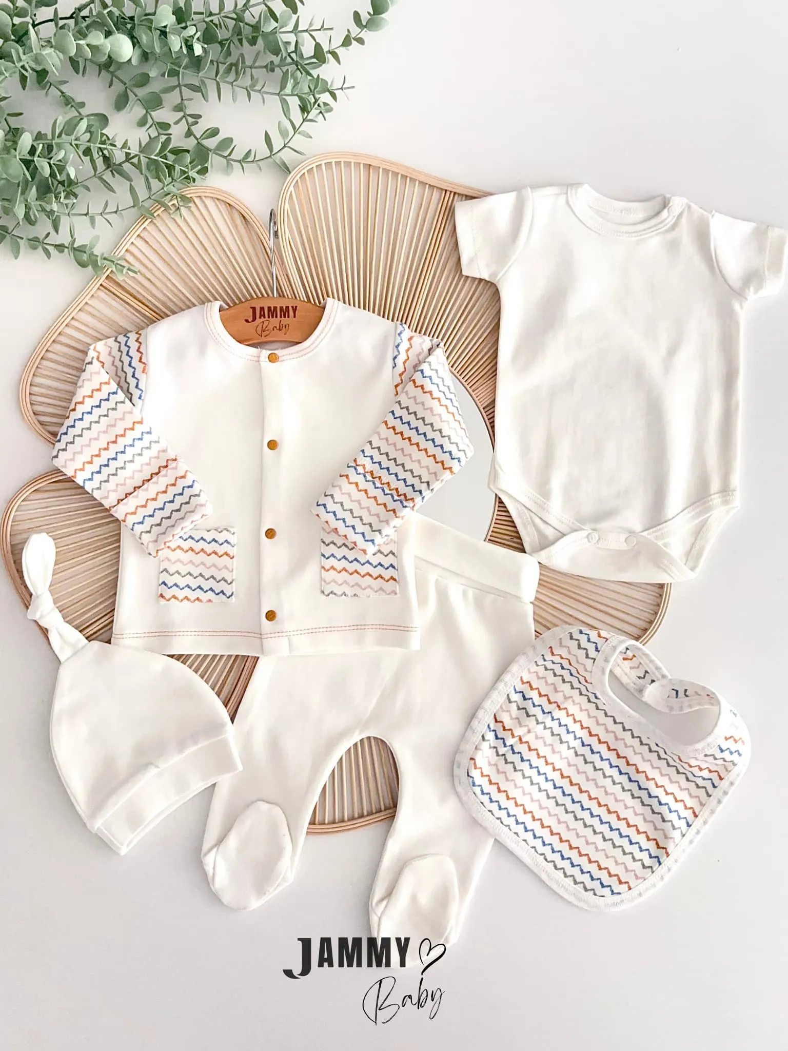 طقم ناعم مكون من 5 قطع للبنات الرضع بأكمام طويلة، يشمل بنطلون، قبعة، قفازات ومريلة للراحة والأناقة في جميع الفصول.