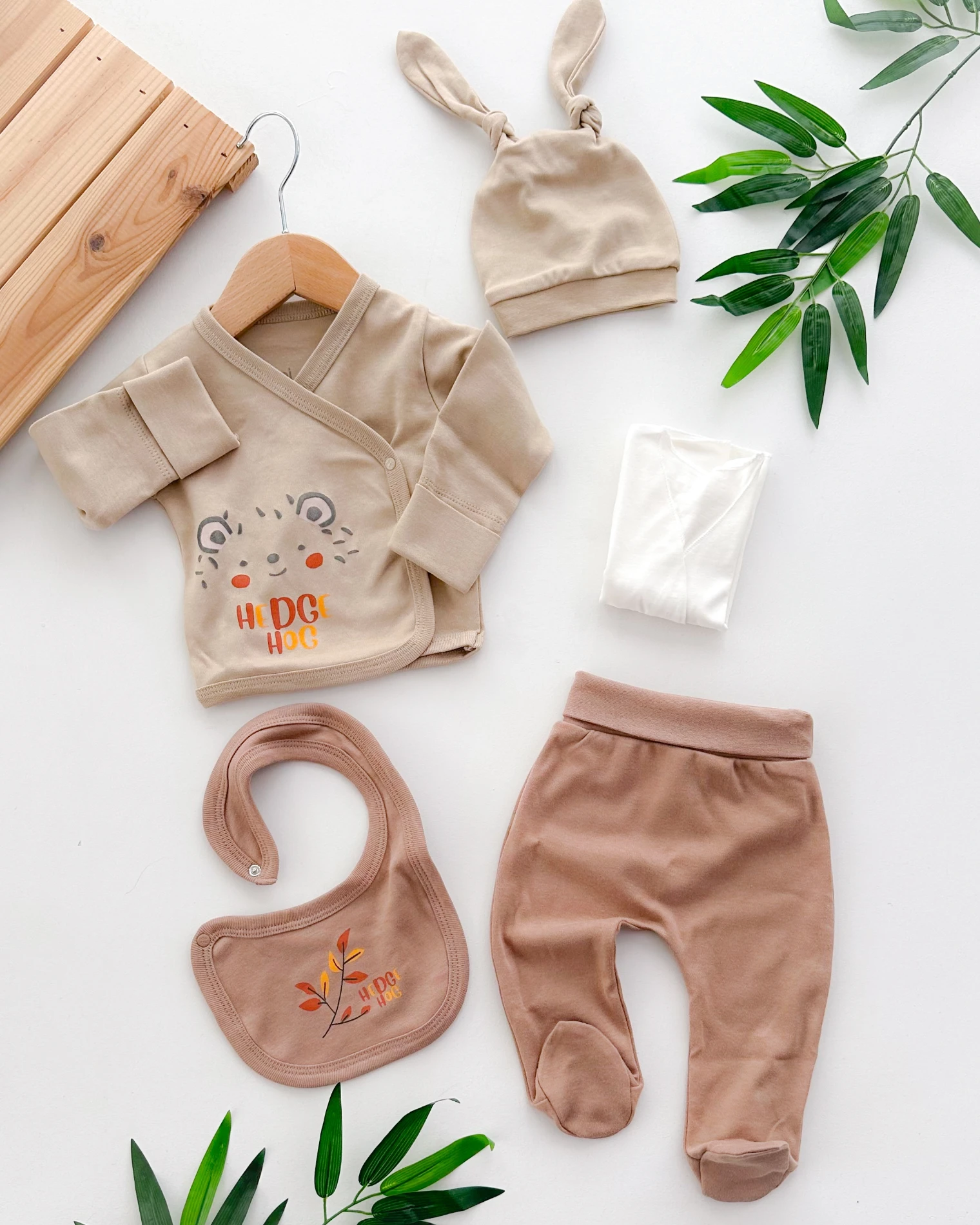 طقم ناعم مكون من 5 قطع للبنات الرضع بأكمام طويلة، يشمل بنطلون، قبعة، قفازات ومريلة للراحة والأناقة في جميع الفصول.