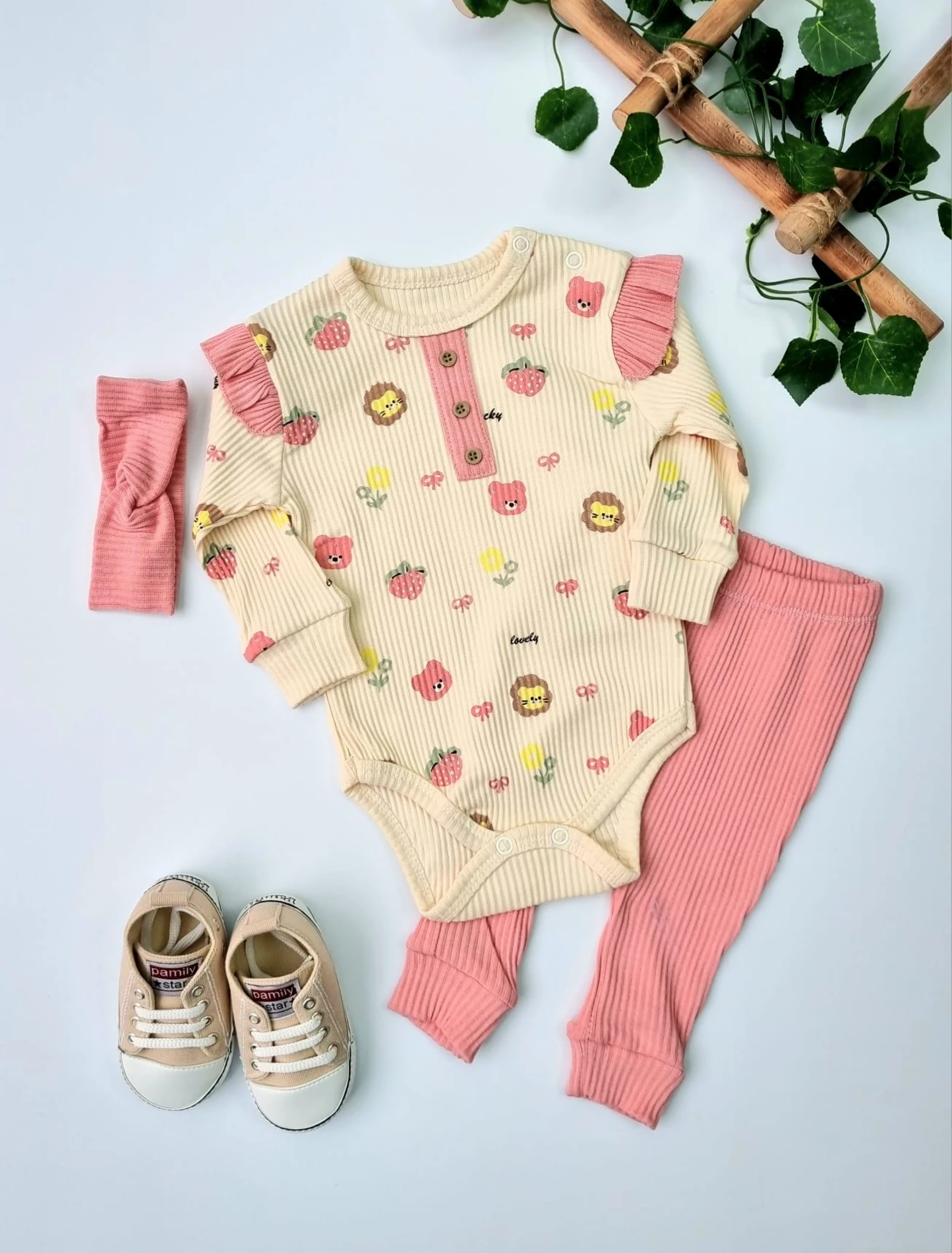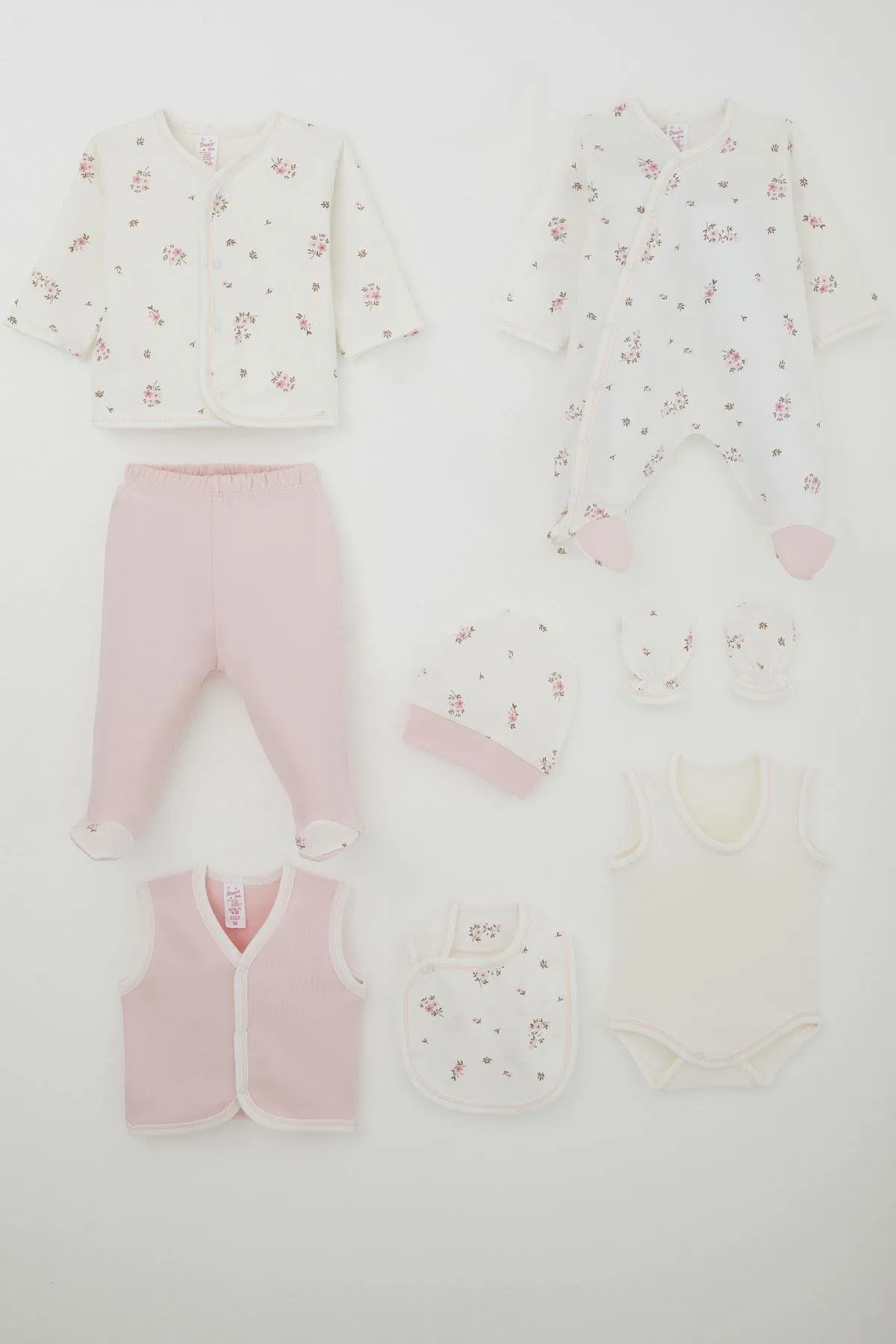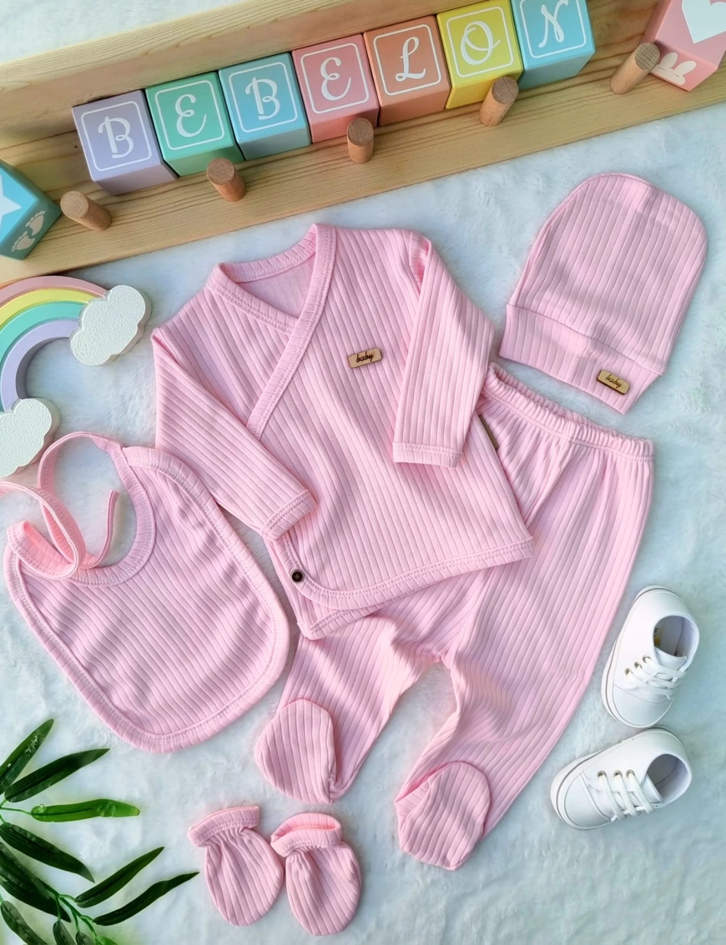طقم حديثي الولادة للبنات يشمل بلوزة بنمط لف مضلعة مطبوعة بياقة على شكل حرف V مع كشكشة وفيونكة، مكون من 5 قطع ناعمة ومريحة للاستخدام اليومي.