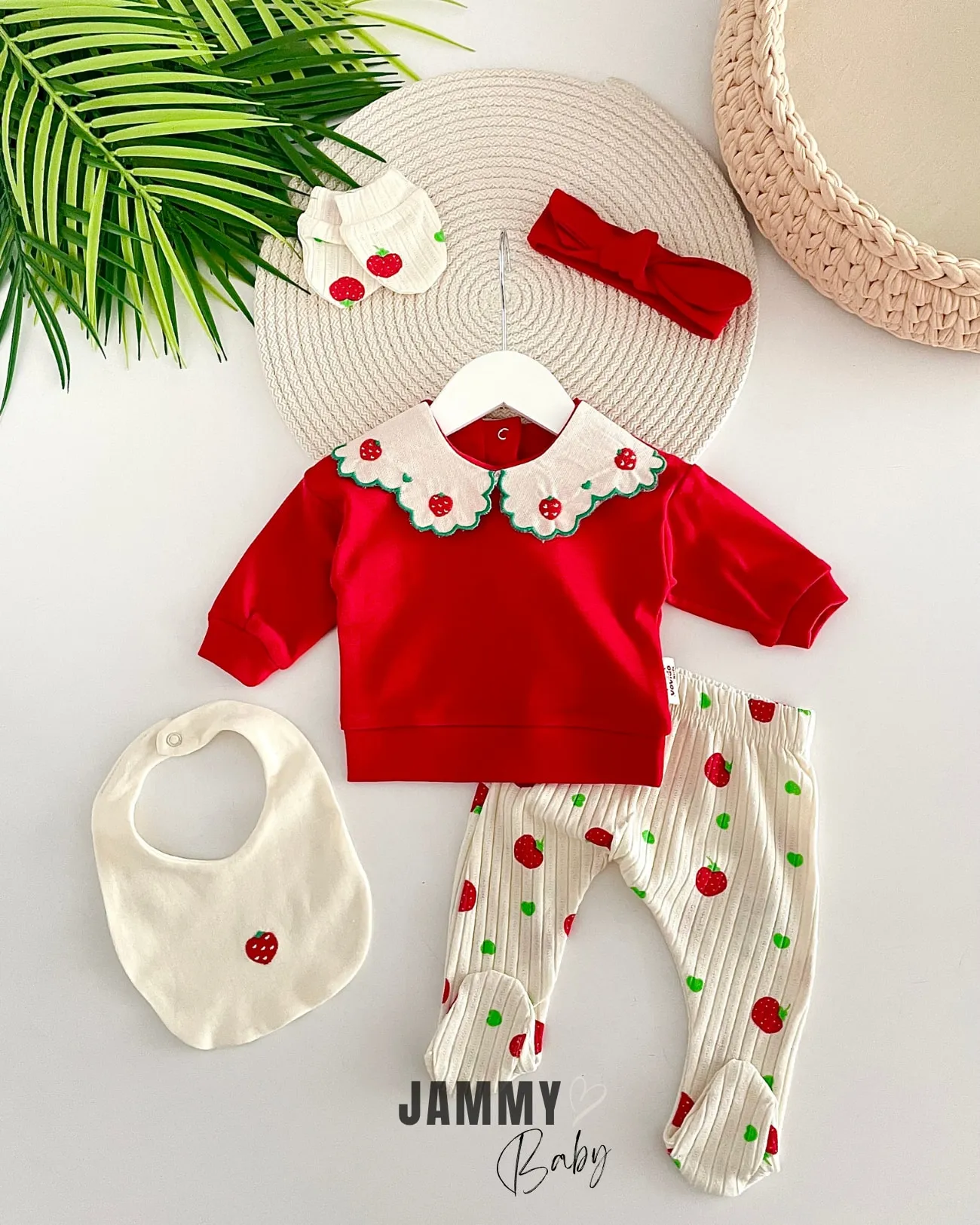 طقم حديثي الولادة مكون من 5 قطع يتميز بتفاصيل دانتيل دقيقة وتطريز زهور، يجمع بين الراحة والأناقة للبنات الرضع.