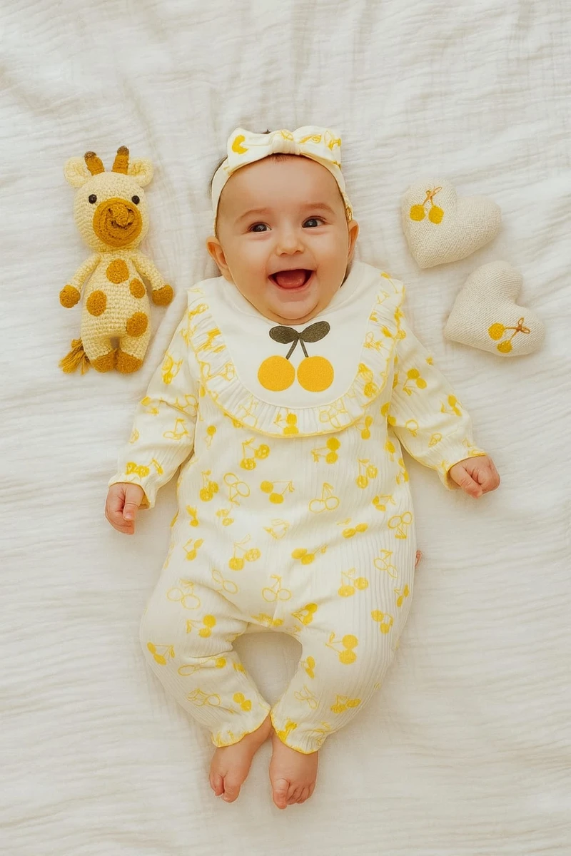 طقم رومبر قطني وافل بتفصيل وردة مع بندانا للبنات الرضع - Beyond Store