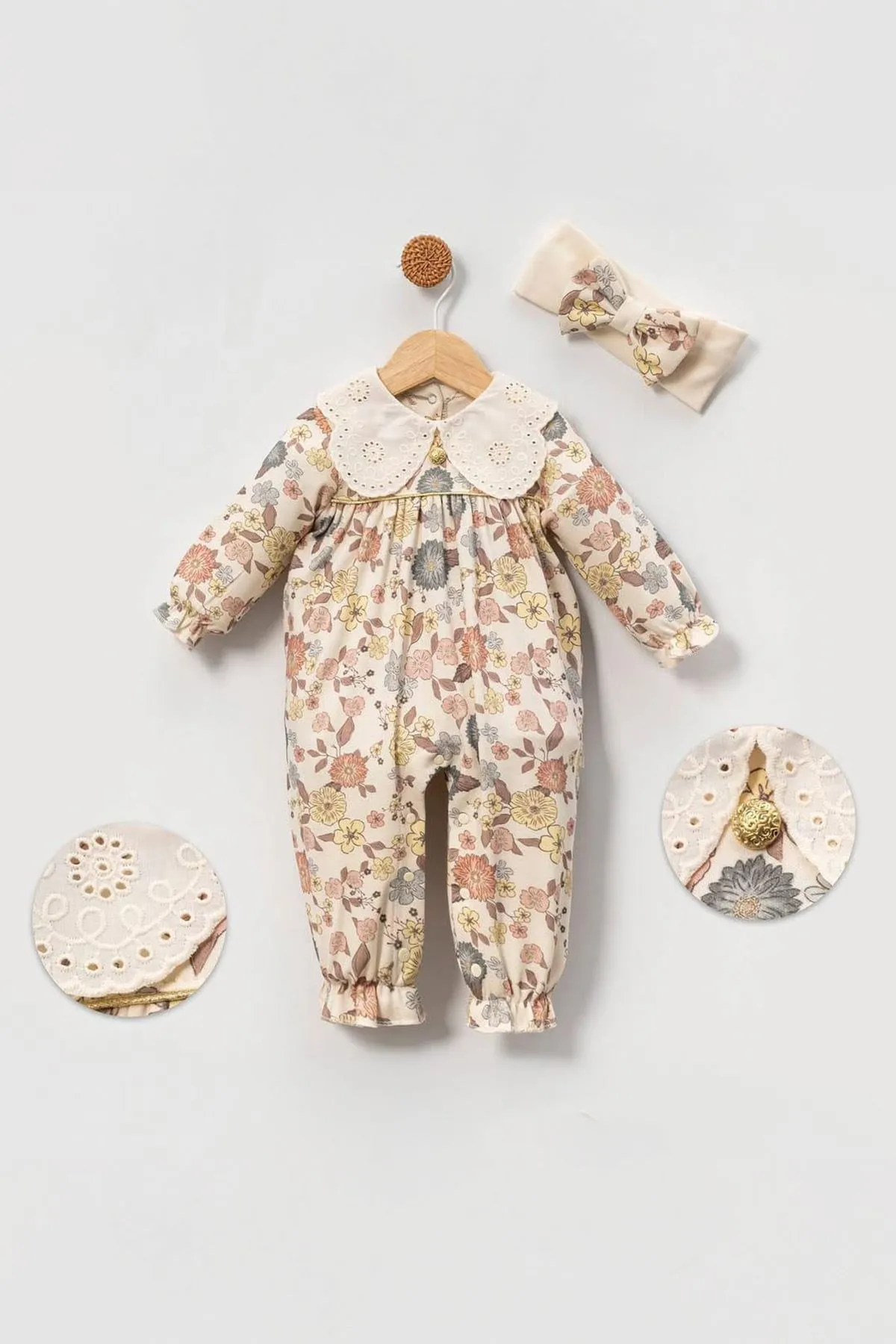 بدلة جسم للبنات الصغار بأكمام طويلة وياقة منتشرة محبوكة ومضلعة ومزينة بكشكشة وأزرار