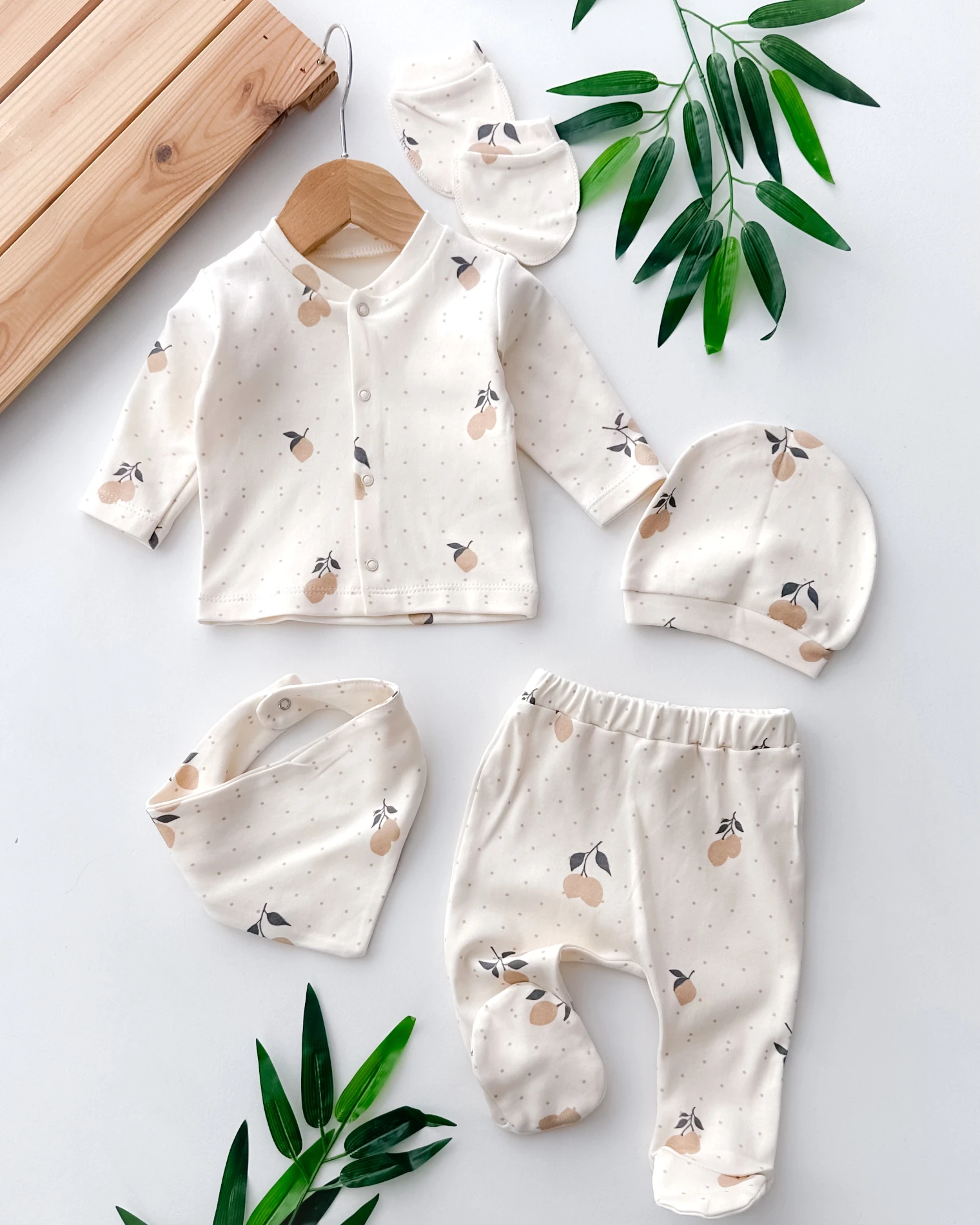 طقم مكون من 5 قطع للبنات الصغار، يضم بلوزة مضلعة بأكمام طويلة وتفاصيل فيونكة مكشكشة مع بنطال بخصر مطاطي وإكسسوارات متناسقة. ناعم ومريح ومثالي لجميع المواسم.