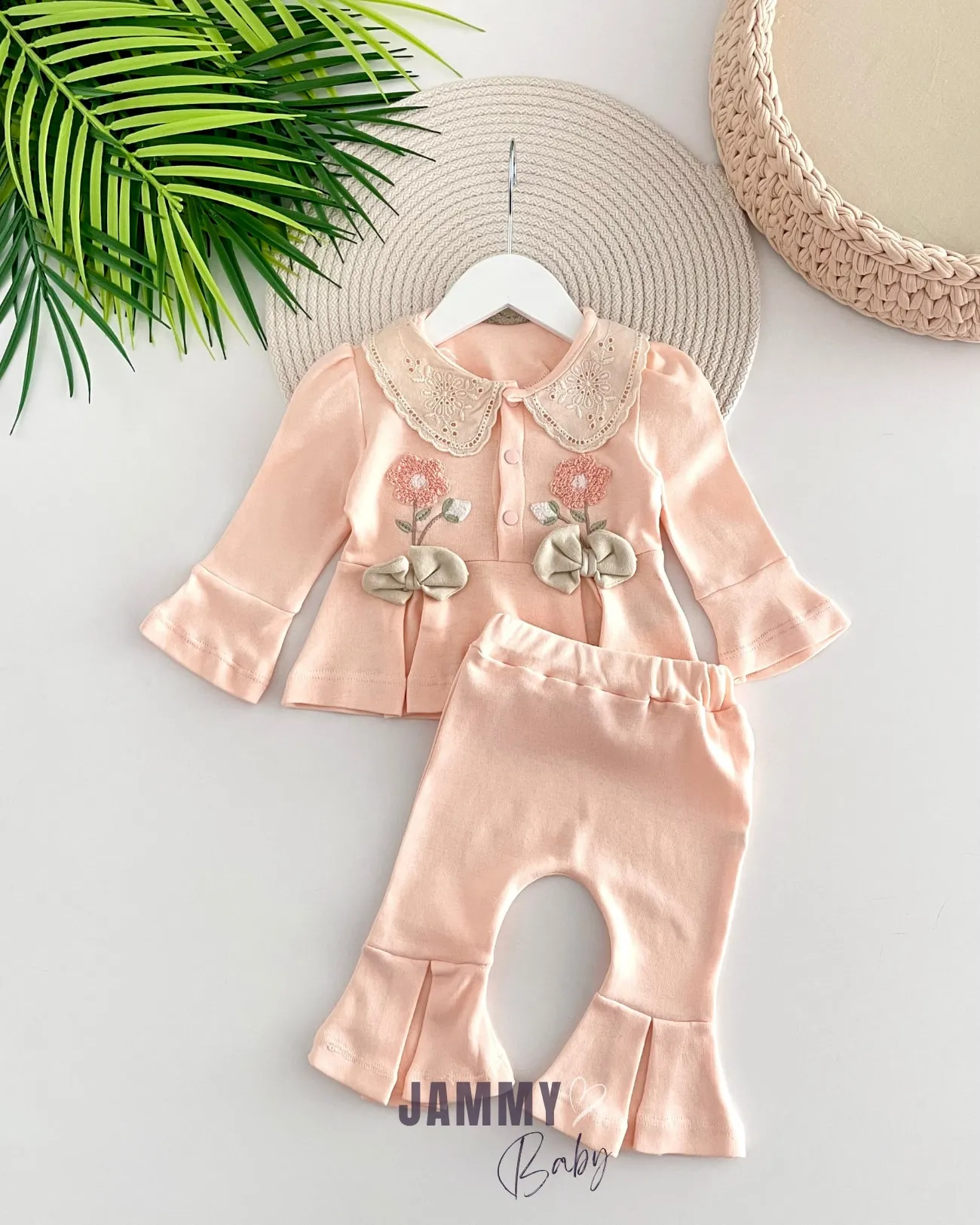 طقم مكون من 5 قطع بأكمام طويلة للبنات الرضع مطرز مع كشكشة وأزرار كبس. ناعم، قابل للتنفس ومريح، مثالي للارتداء اليومي واللعب المرح.