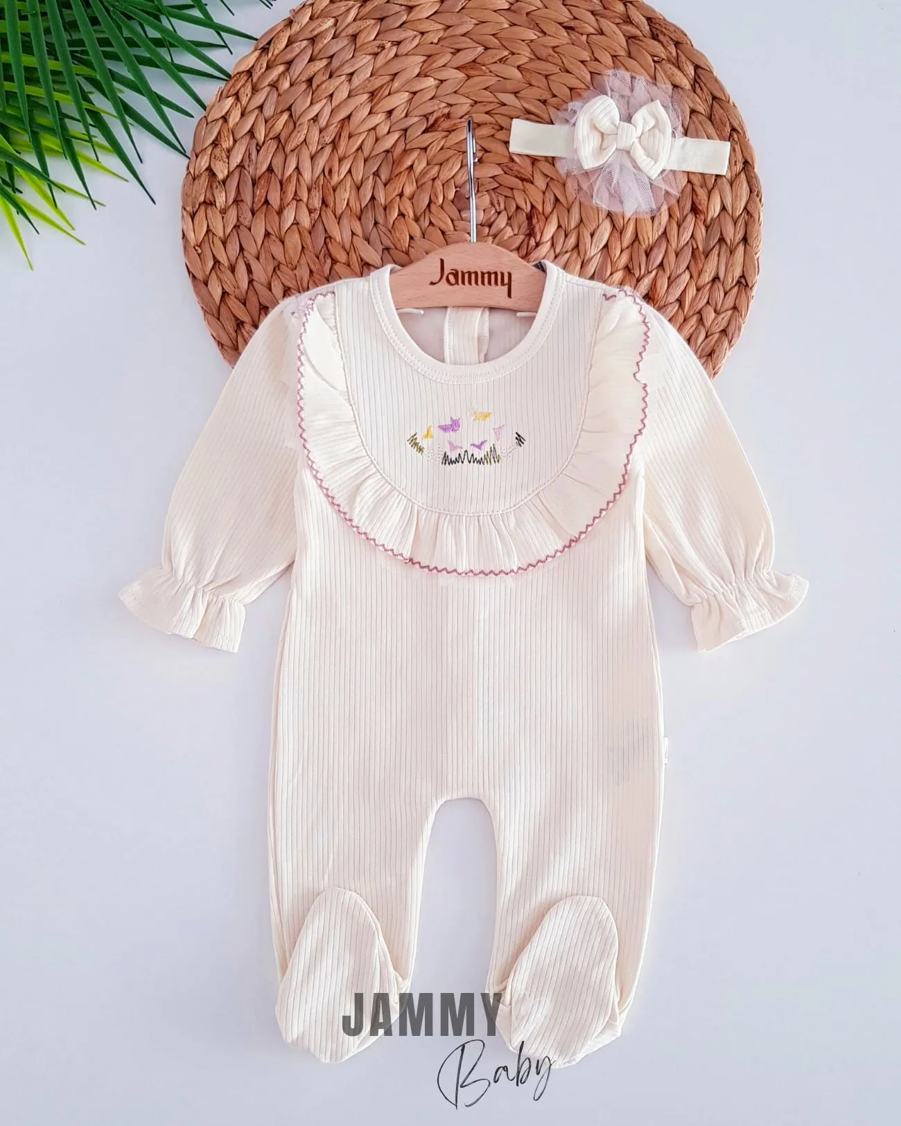بدلة جسم للبنات الصغار بأكمام طويلة مطرزة وياقة بيتر بان مع أزرار كبس. ناعمة ومريحة ومثالية للاستخدام اليومي.