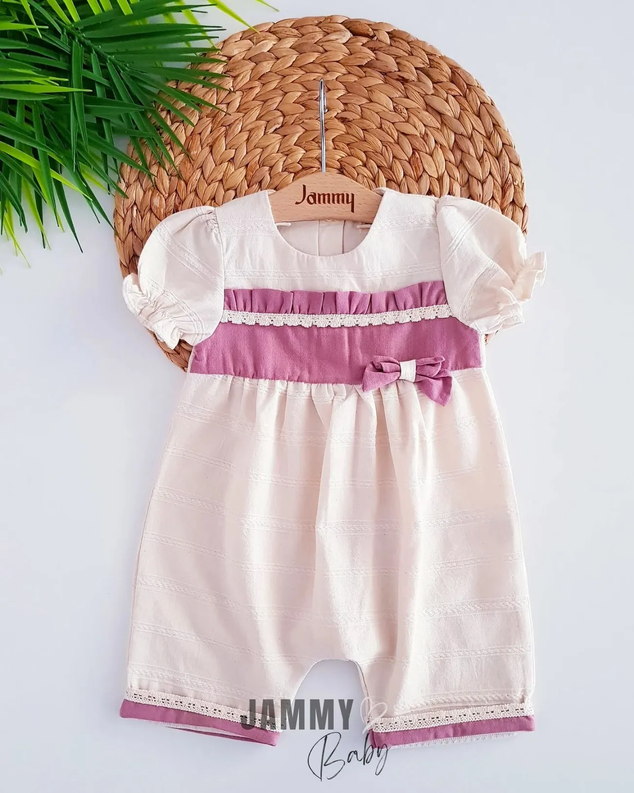 بدلة جسم للبنات الصغار بأكمام قصيرة منتفخة وياقة دائرية مع أزرار كبس. ناعمة ومريحة وعملية للارتداء اليومي.