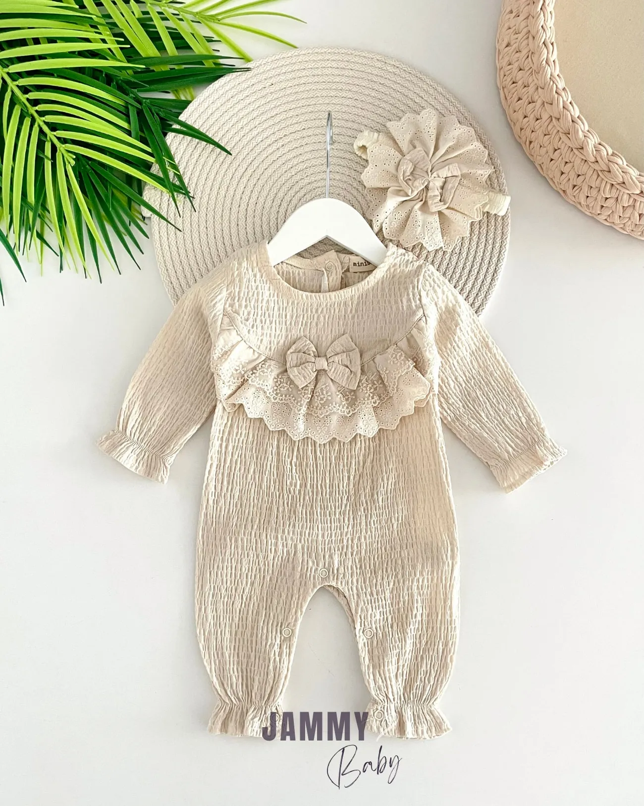بدلة جسم للبنات الصغار بأكمام طويلة بيشوب وياقة دائرية، مع تفاصيل من الدانتيل وإبزيم. ناعمة وأنيقة ومريحة للارتداء اليومي.