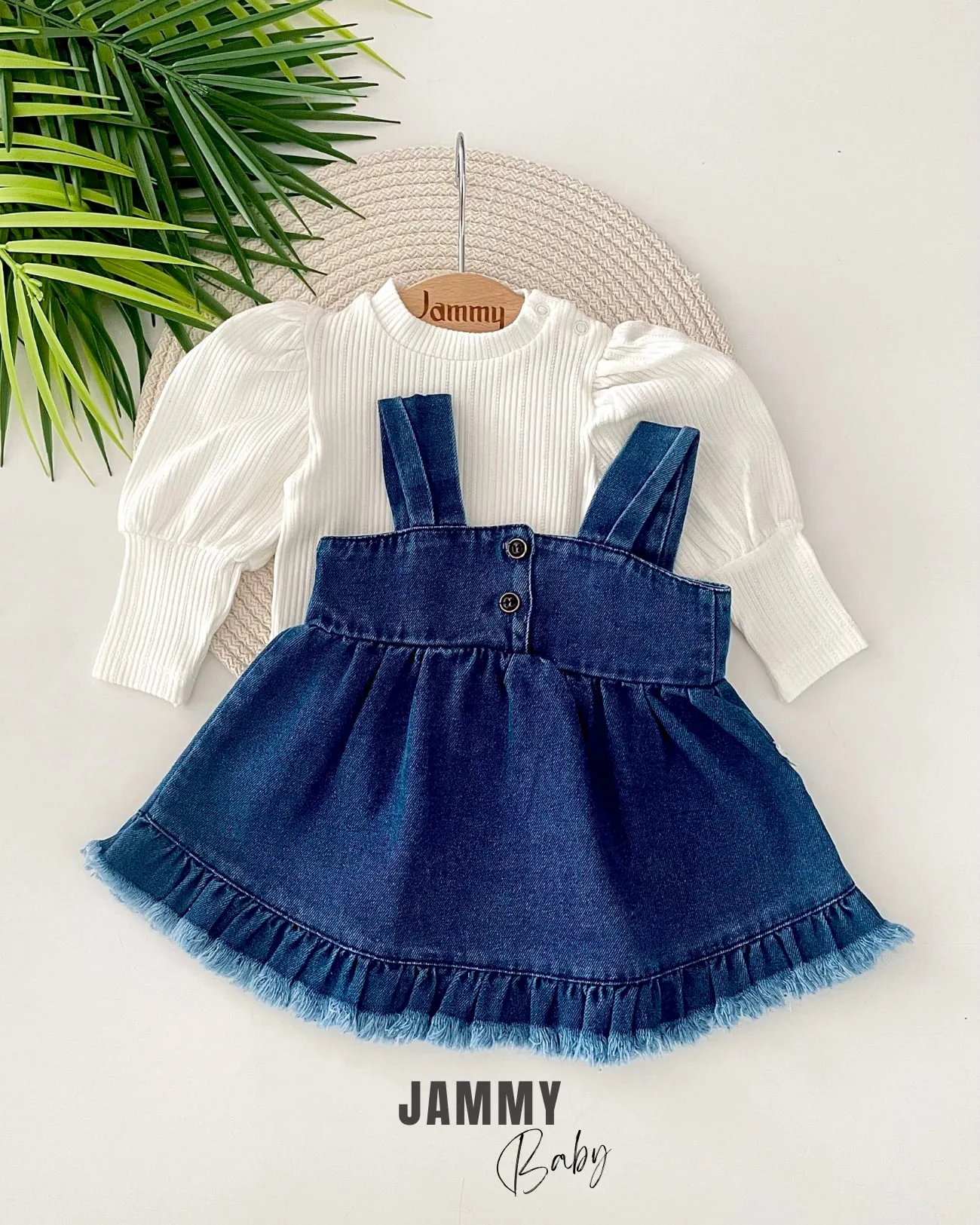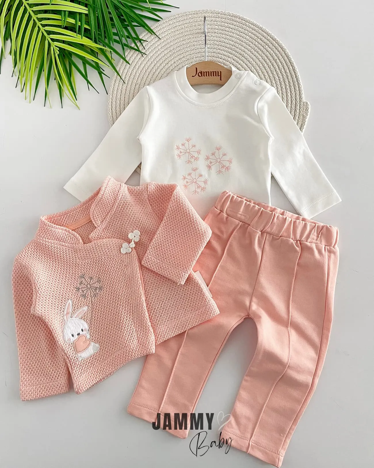 طقم مكون من 3 قطع للبنات الرضع بأكمام طويلة مطبوعة مع كشكشة وخصر مطاطي. ناعم، قابل للتنفس ومريح، مثالي للارتداء اليومي واللعب المرح.