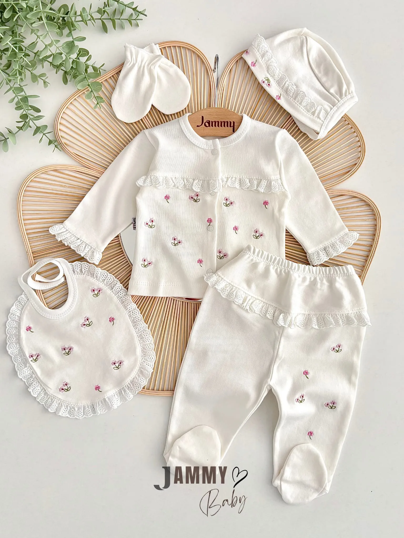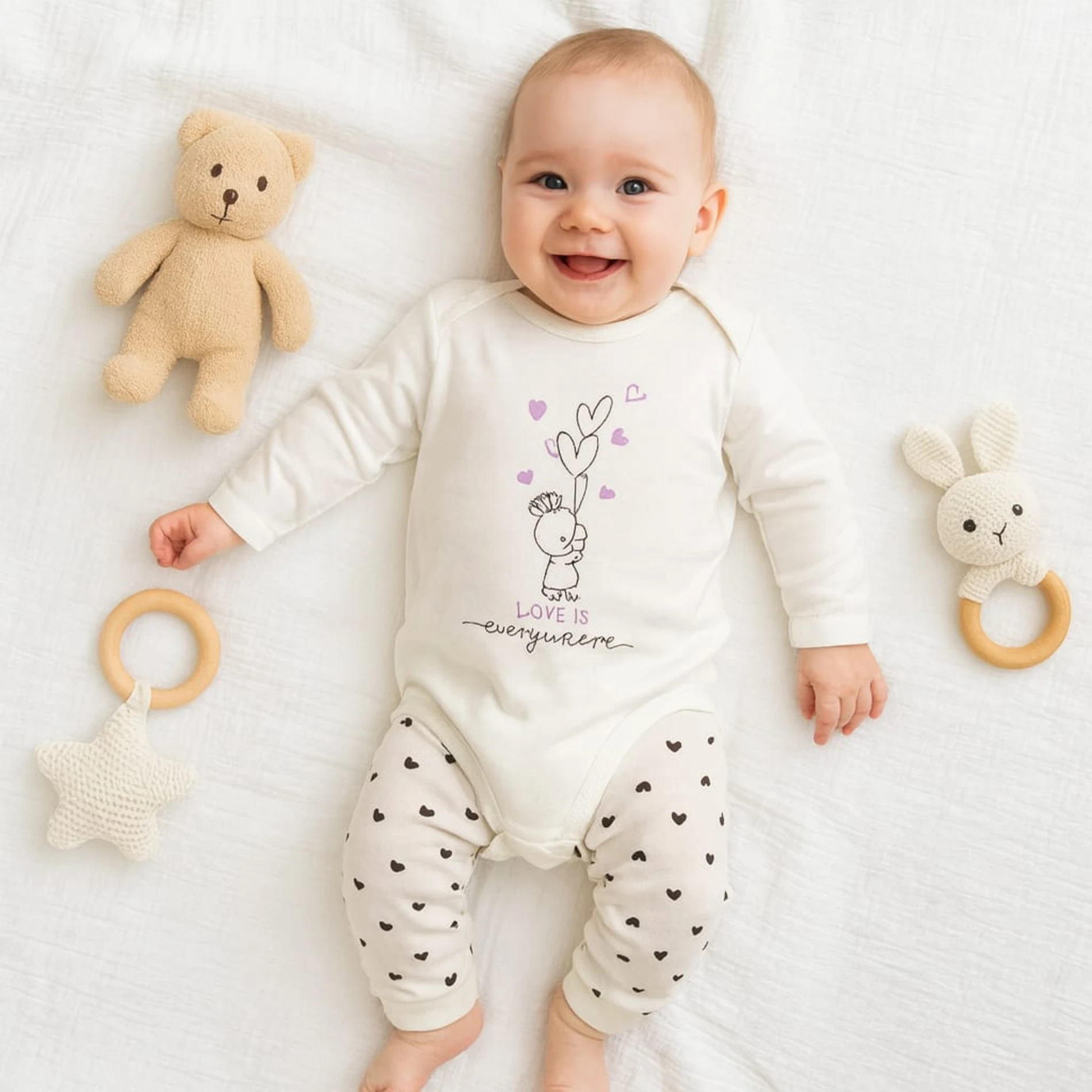 طقم مكون من 3 قطع للبنات الرضع بأكمام طويلة مطبوعة مع كشكشة وخصر مطاطي. ناعم، قابل للتنفس ومريح، مثالي للارتداء اليومي واللعب المرح.