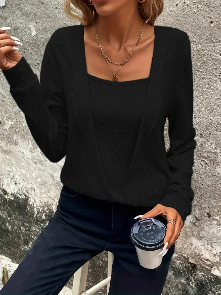 بلوزة مضلعة بياقة عالية وأكمام طويلة بقماش مرن وناعم لإطلالة شتوية مريحة وأنيقة.