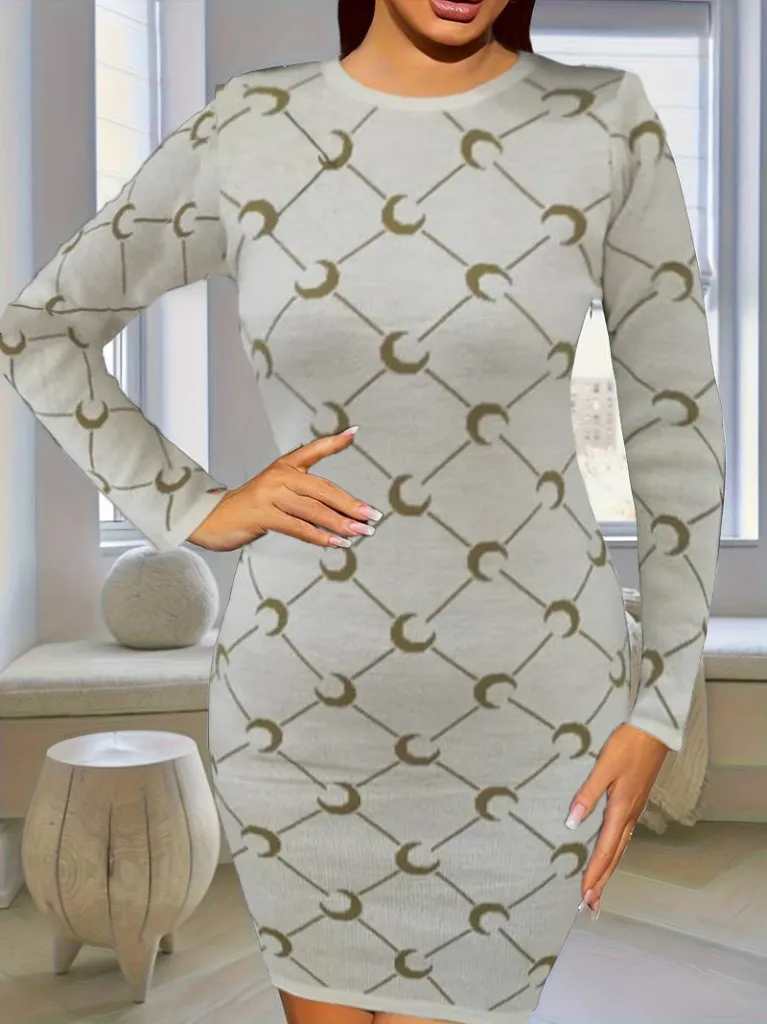 فستان تريكو مخطط بياقة مرتفعة وتصميم ضيق لإطلالة دافئة في أيام الشتاء.