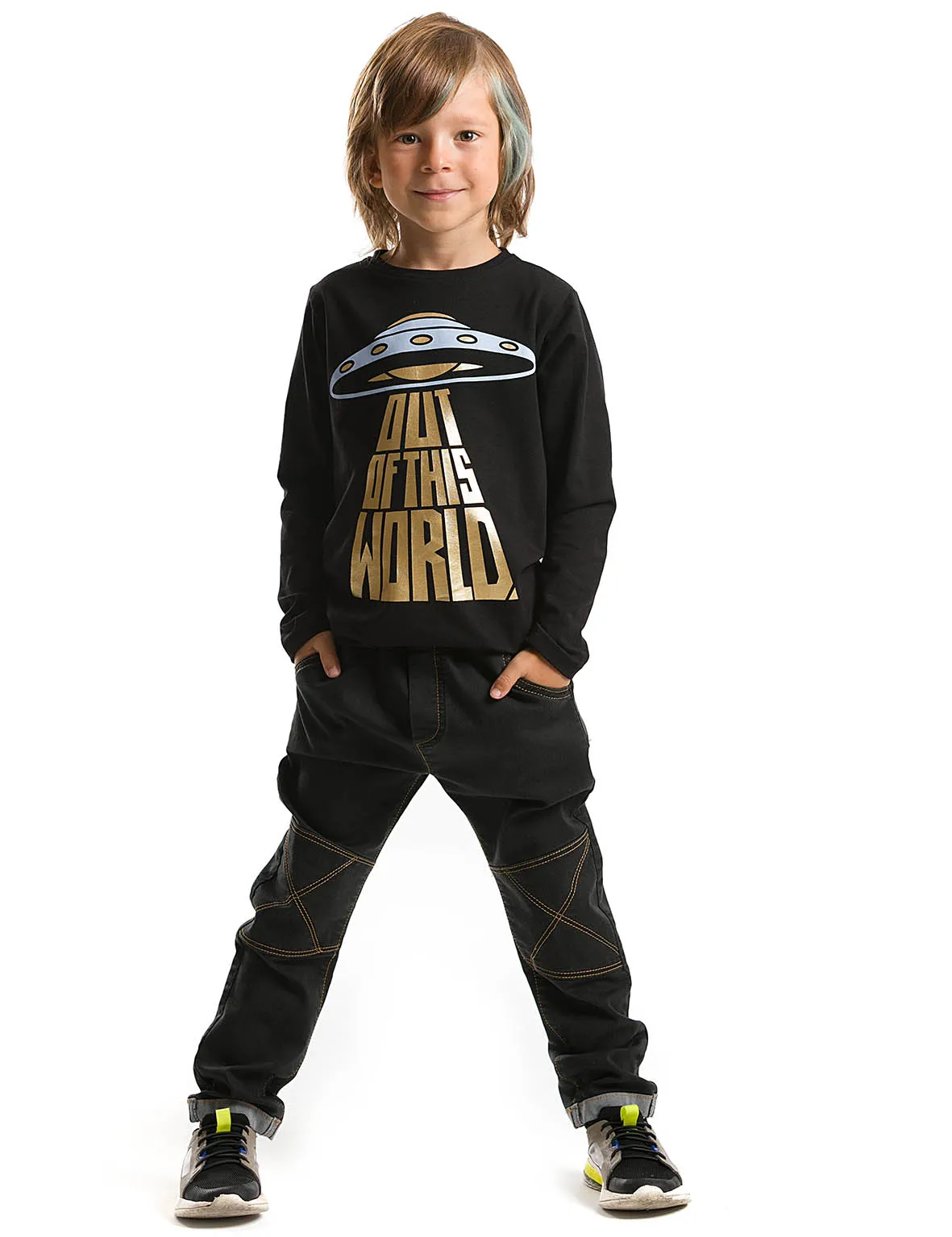 طقم أولاد من قطعتين – تيشيرت قطن مطبوع وبنطلون جينز مغسول مع تطريز