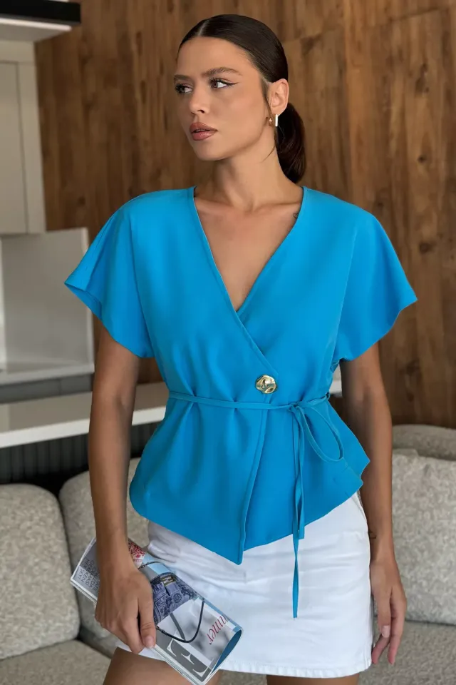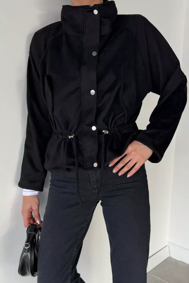جاكيت نسائي من الجلد الصناعي بحزام خصر وأزرار مزدوجة