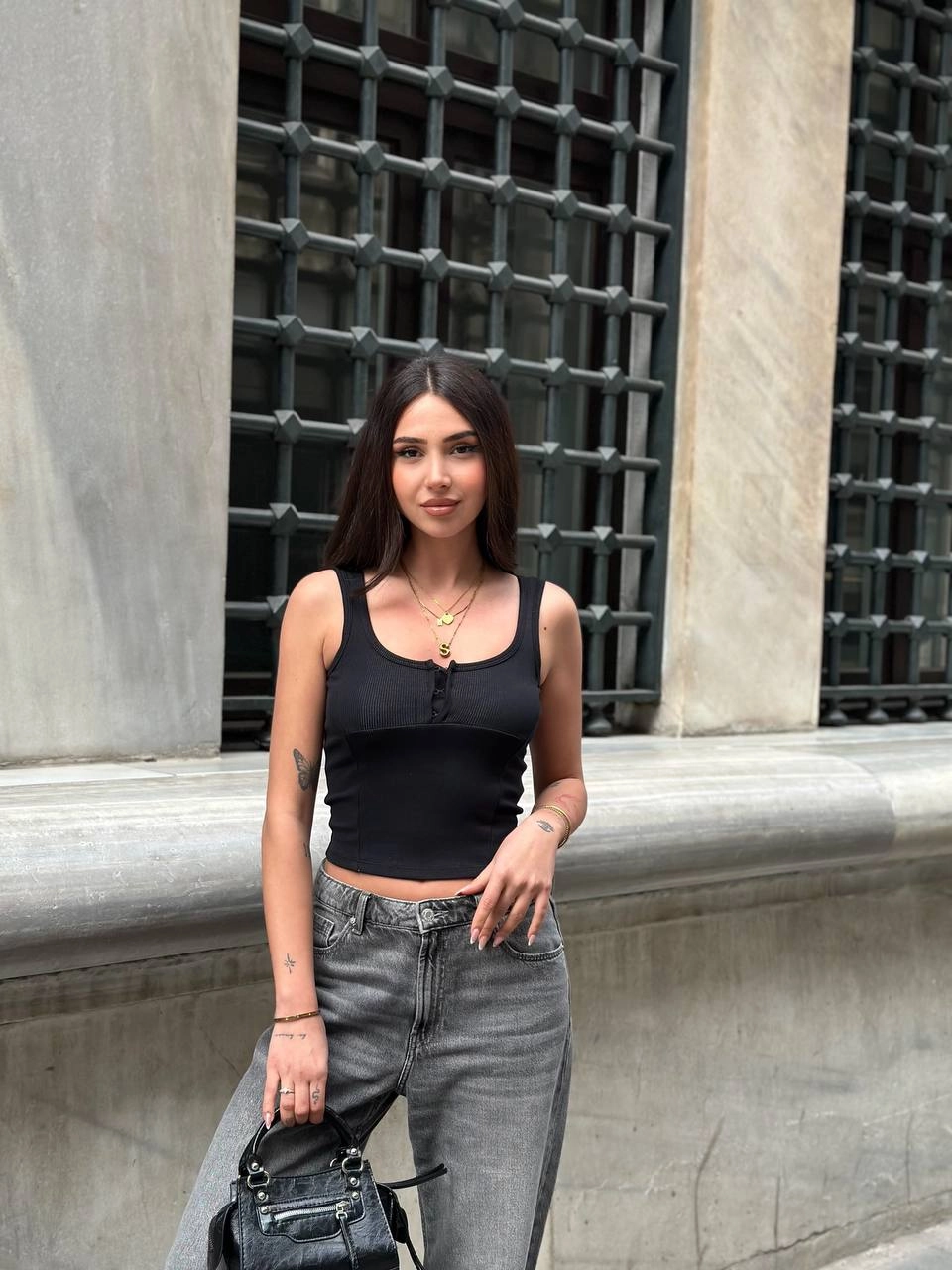 بودي نسائي ضيق مزين بالأحجار بأكمام طويلة وياقة مدورة نصف مدورة - Beyond Store