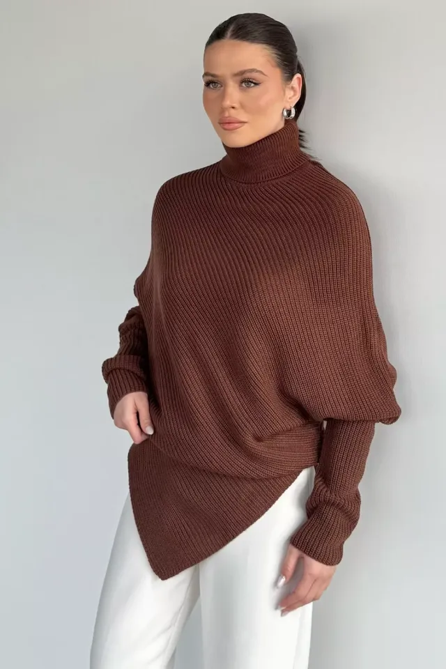 كنزة نسائية بسَلسة خالية من التّفاصيل الجانبية وياقة قائمة وأكمام طويلة وكتف منخفض لستايل مريح يومي في الخريف والشتاء.