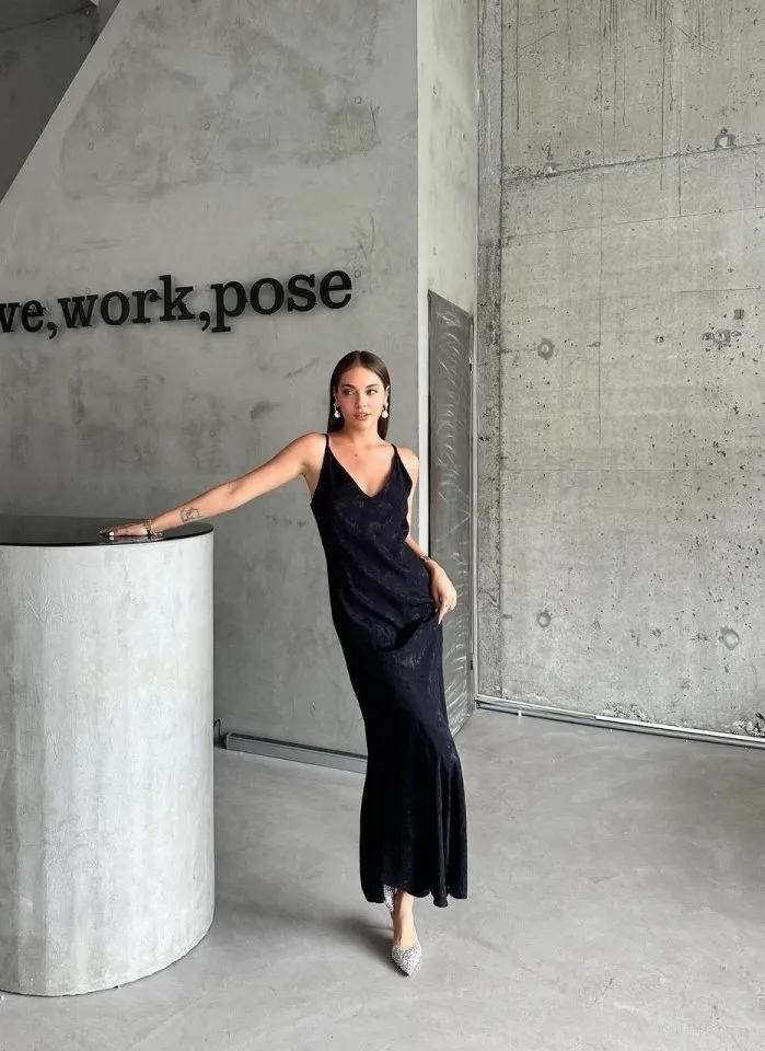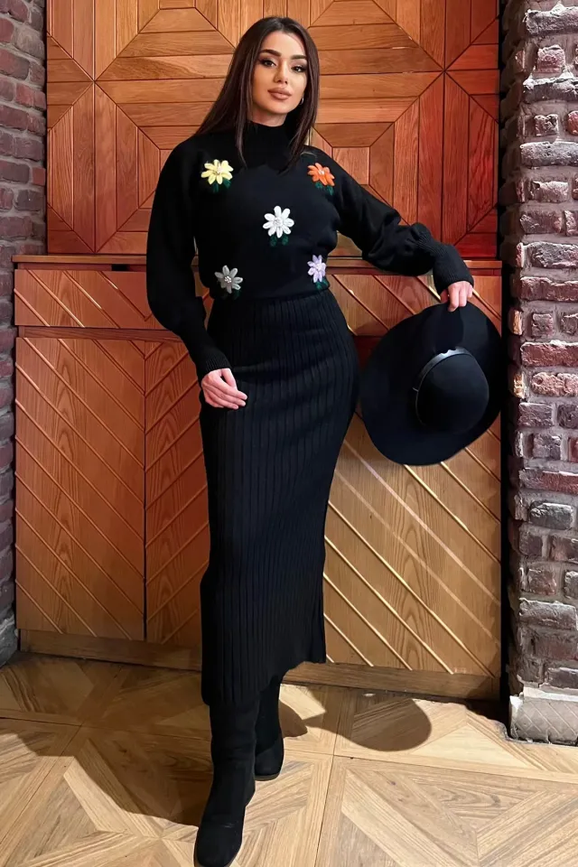 فستان تريكو واسع بياقة عالية وفتحة أمامية لإطلالة يومية شتوية أنيقة ومريحة.